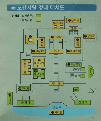 도산 서원의 배치도를 보면.. 퇴계 생존 시와 사후에 따라 건축물이 뒤쪽으로 추가되었다.