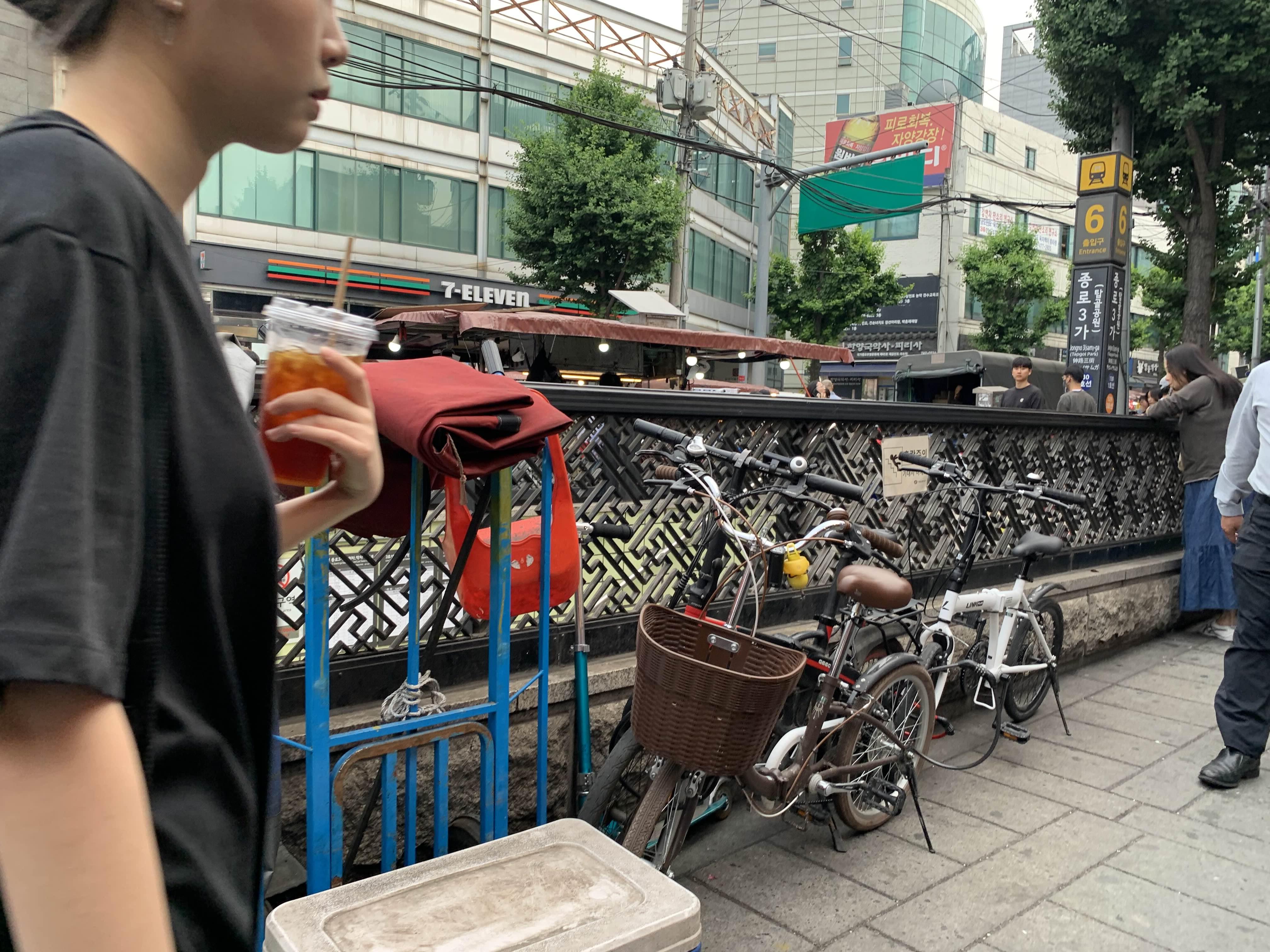 자전거를 전천열 근처 계단 난간에 고정하고... 식당으로 이동!