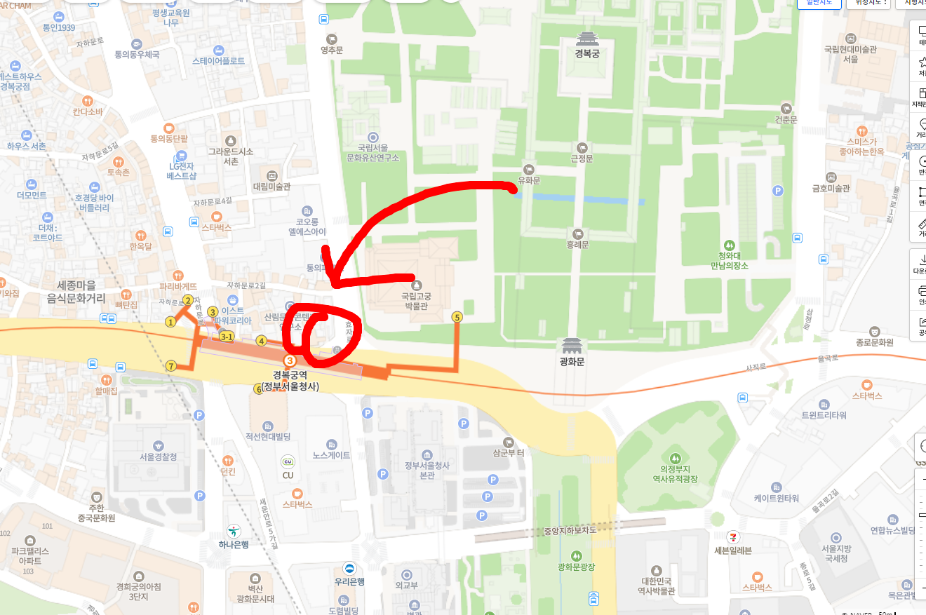 자전거 주차는 경복궁 담장에 주차가 불가합니다. 그래서.. 경복궁역 출구 쪽에 마련된 자전거 보관소에 주차가 필요합니다. ㅎㅎ