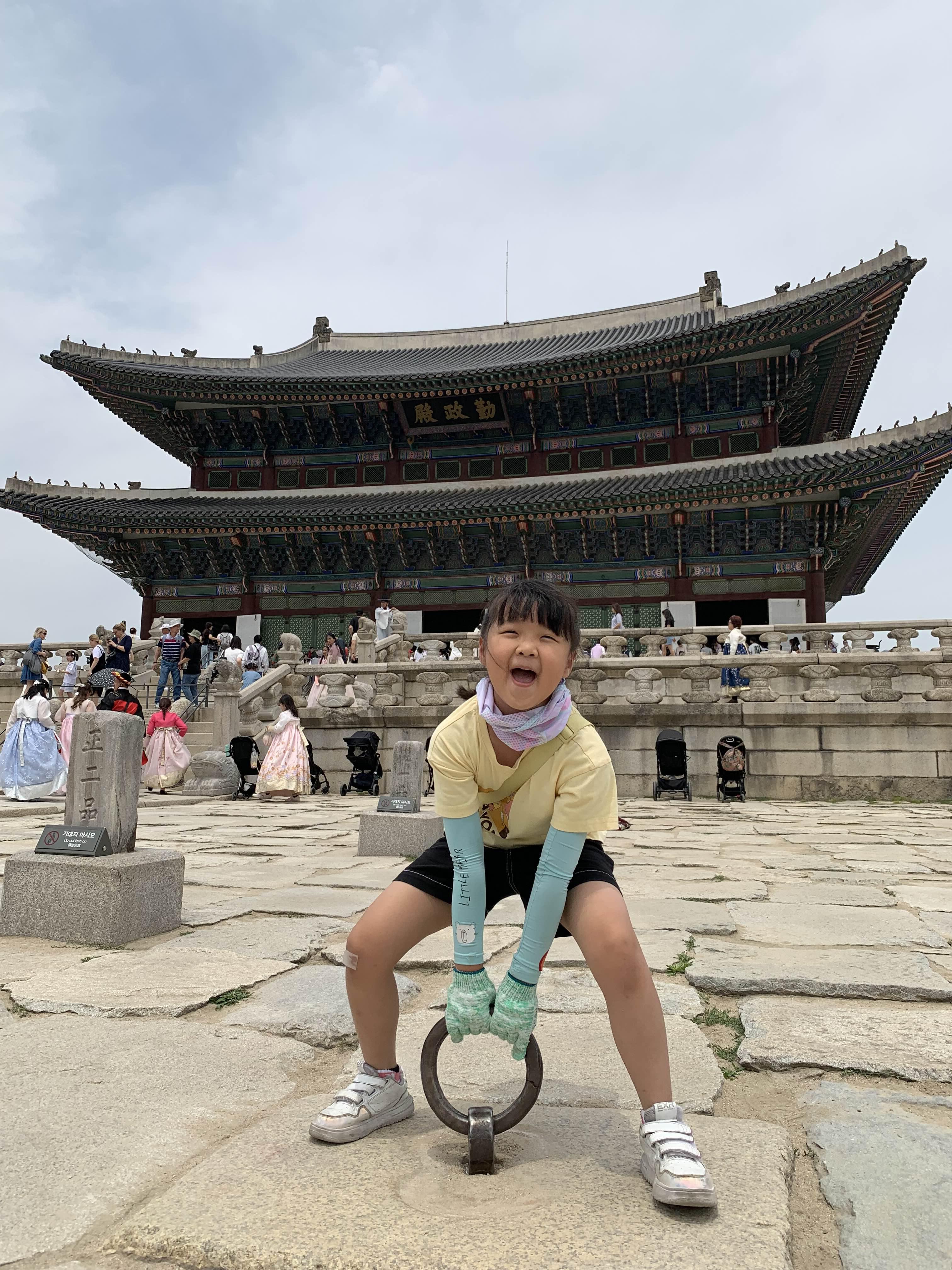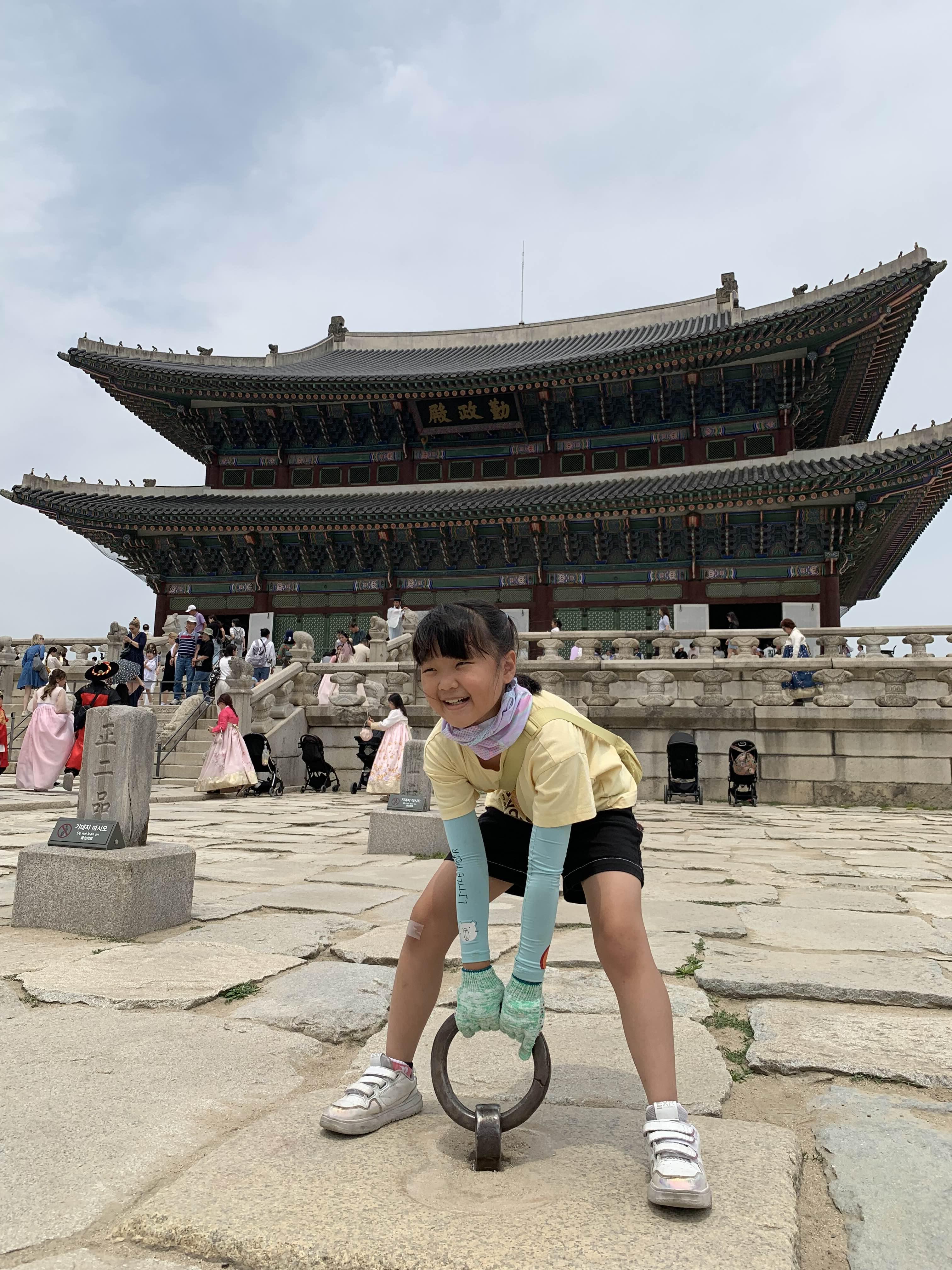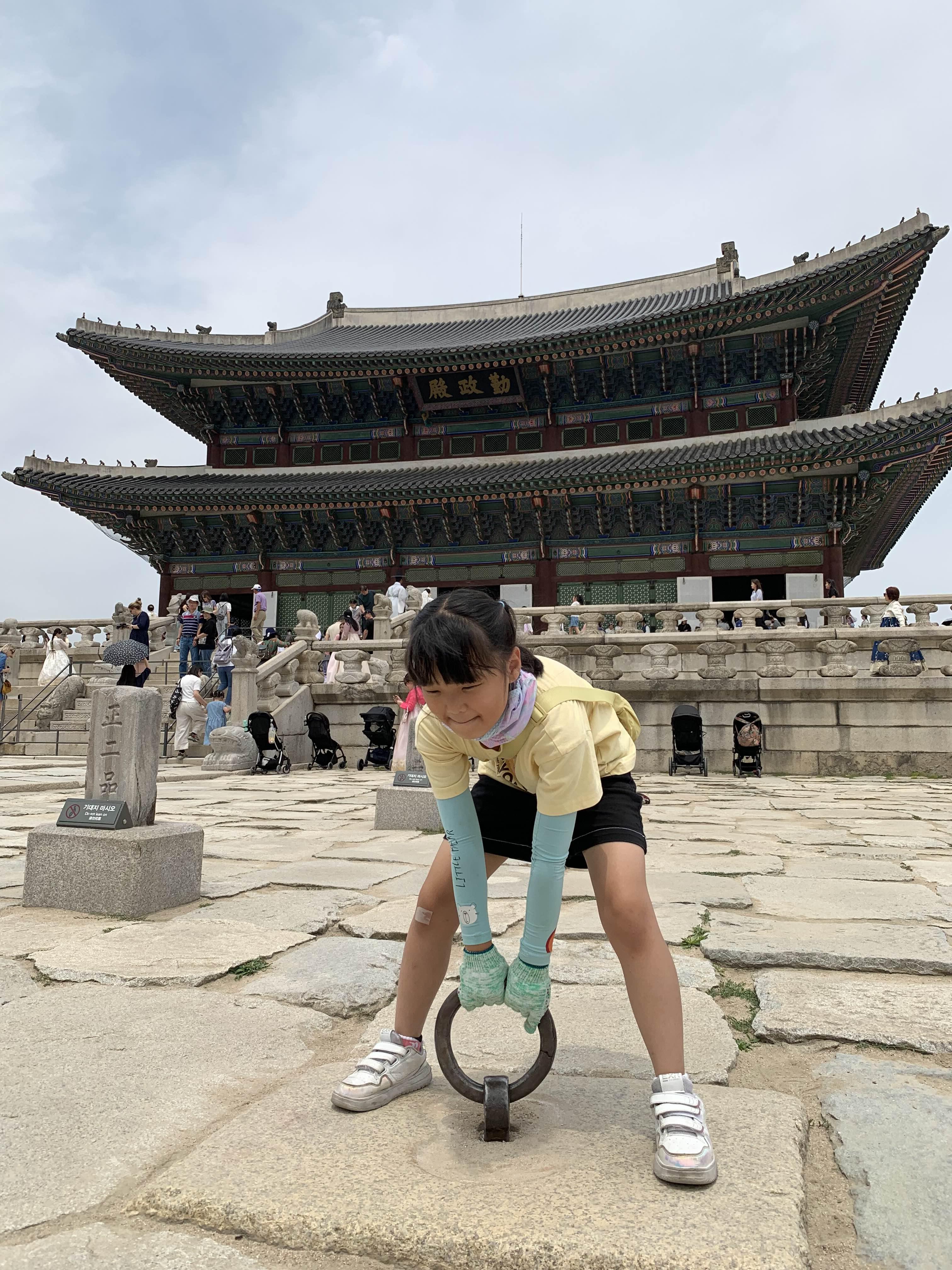 근정전 바닥에 고정되어 있는 차일고리를 가지고 놀고 있다.ㅎㅎ