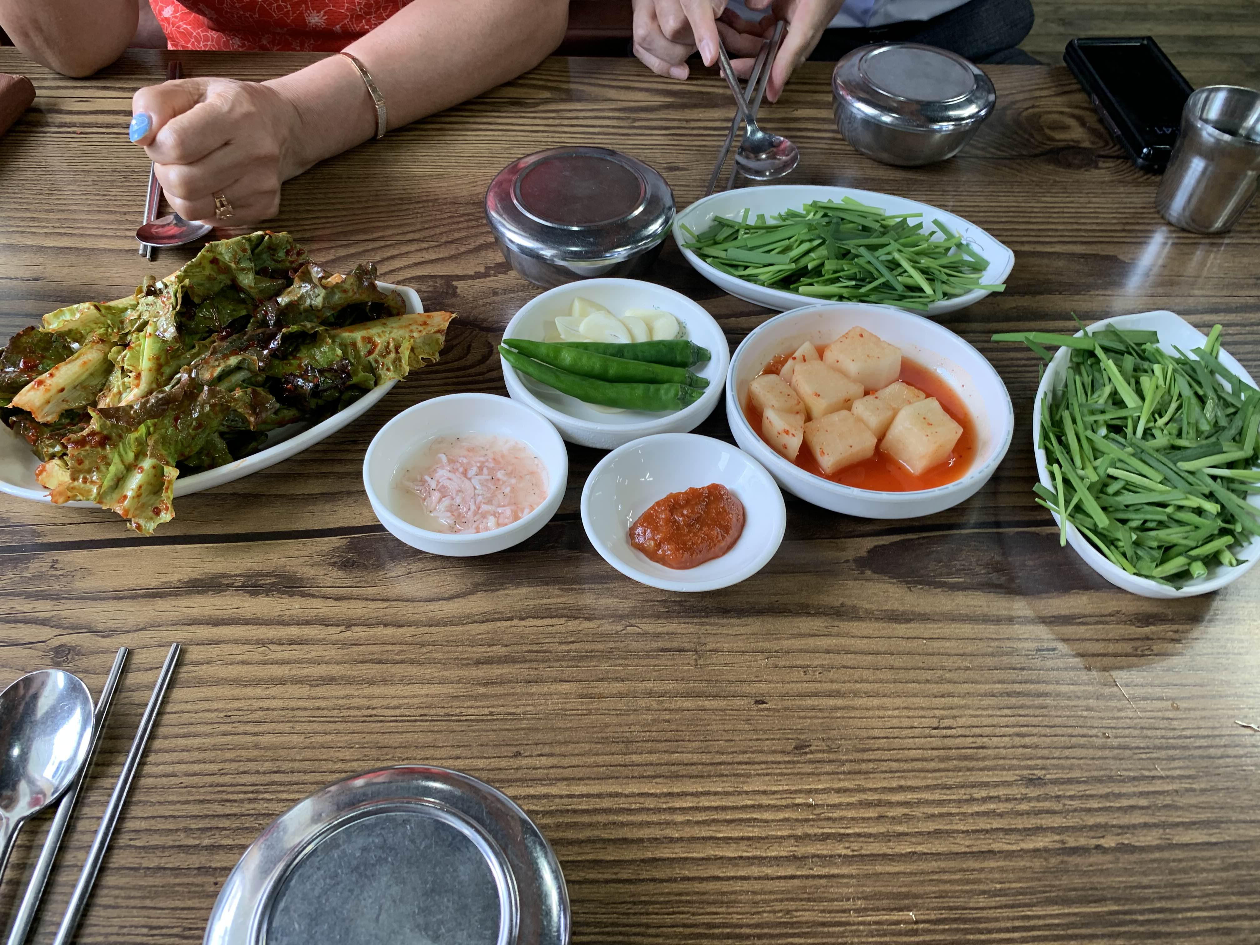 음식을 주문하면... 밑반찬으로 상추무침과 깍두기...