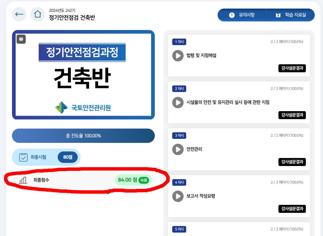 정기안전점검 수료를 하려면.... 진도율 20%, 시험 80%..... 합산하여 70점 이상이어야 수료가 가능하다.