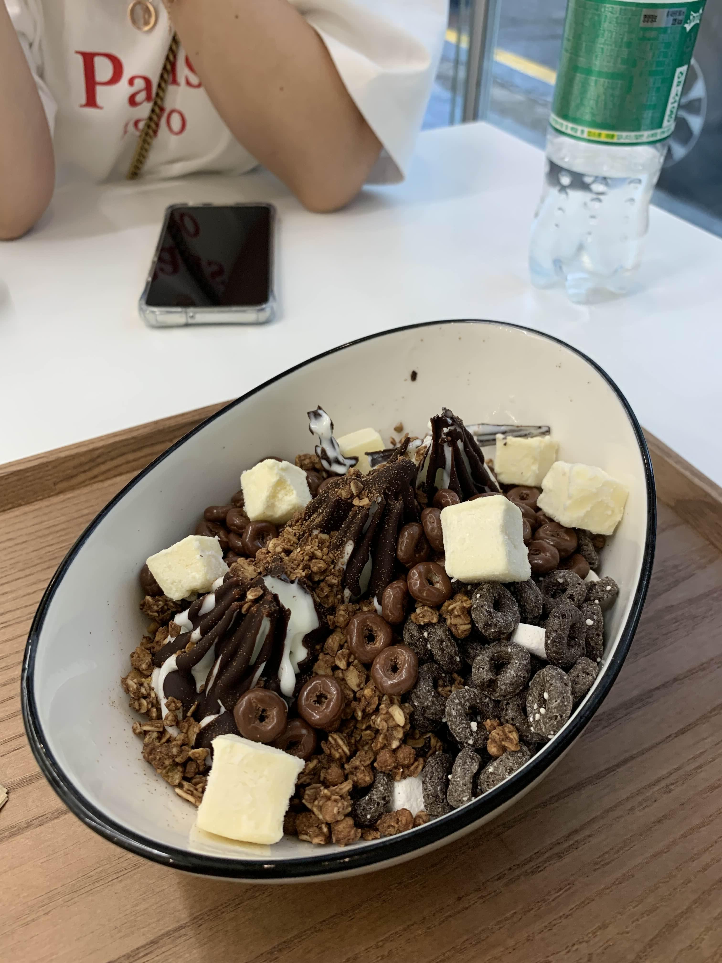 아래쪽에는 아이스크림이 있고... 위 토핑으로 치즈와 초코... 그리고 과자!