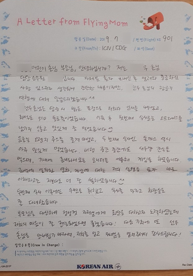 대한항공 홈페이지에 보면 "5시간 이상의 중/장거리 비행 편에서는 어린이 승객의 비행 중 모습을 편지로 작성해 도착지 보호자에게 전달하는 ‘플라잉 맘 서비스(Flying Mom Service)’를 제공합니다."라는 문구가 있어서.... 비행 중 5시간 지나면 아이 사진을 찍어서 핸드폰으로 보내주는 서비스?구나 생각을 했었습니다. 근데 5시간이 지나도 문자가 없네요. 도착지 보호자에게 문자를 보냈는지 확인해보 문자가 없네요. 선우가 도착해보니..... 문자가 아닌 손편지를 써서 도착지 보호자에게 전달해주는 서비스입니다. 승무원분들 참 고생이 많다는 생각이 드네요. 비행기에서 손편지까지 쓰시고^^ 이렇게 손편지를 받아본 지 얼마 만인지?(도착지 친척이 받았지만) 정말 오랜만에 받아보는 손편지이고, 아이가 비행기에서 어떻게 보냈는지 상상이 가는 내용이더군요^^