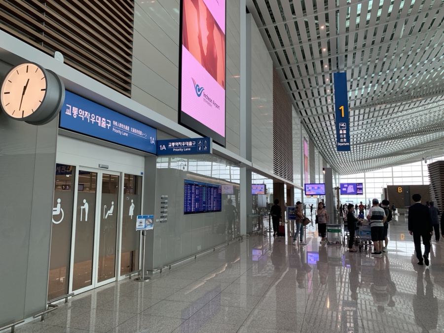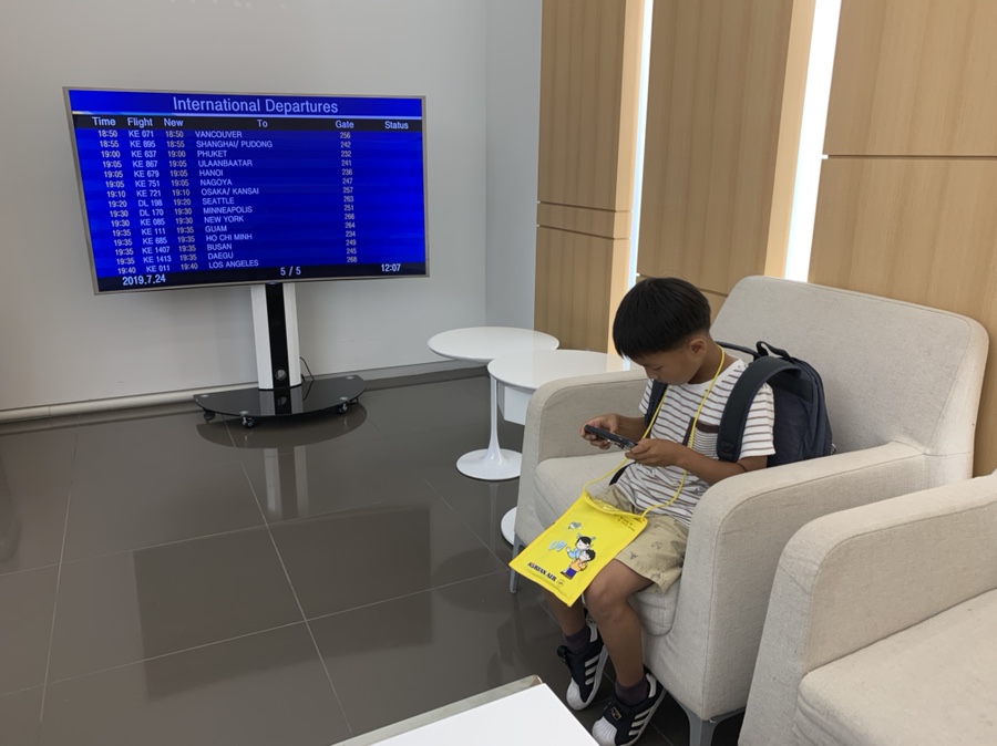 약속 시간이 약 30분가량 남아서 편의점에서 아이 간식을 조금 구입하고 패밀리 라운지에서 휴식을 취했네요. 아이가 12시간 비행 중 심심하지 않도록 내 구형 아이폰에 아이가 좋아하는 게임도 하나 설치해 주었습니다.^^ 아빠와 헤어진다는 생각은 안 하고 신나게 핸드폰을 보고 있네요. 비행기 타면 아빠와 헤어진다고 이야기하니..... "아빠 장난하지 말고, 아빠 2주 후에 오잖아, 조심히 와" 아이가 다 컸나 봅니다.;;; 약속시간이 다 출국 게이트로 출발합니다~~