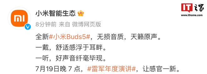 IT하우스는 샤오미가 7월 19일 오후 7시에 제5회 레이준 연례 연설을 개최하고 샤오미 버즈 5 헤드폰도 출시할 예정이라고 공식 발표했다고 16일 보도했다.