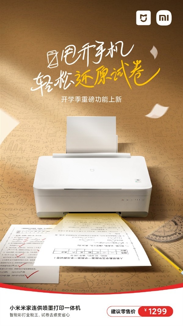 샤오미(Xiaomi Mijia) 연속 잉크젯 프린팅 올인원(Xiaomi Mijia Continuous Inkjet Printing All-in-One)'이 시험지에 답안 흔적과 수정 흔적을 자동으로 제거해 깨끗한 시험지 사본을 생성할 수 있는 새로운 기능을 발표했다. 이 제품은 2022년 3월 출시됐으며 가격은 1,299위안이다. PDF, JPG 등 다양한 파일 형식의 출력을 지원하며, 여러 페이지를 스캔해 PDF 파일로 보관할 수 있다.