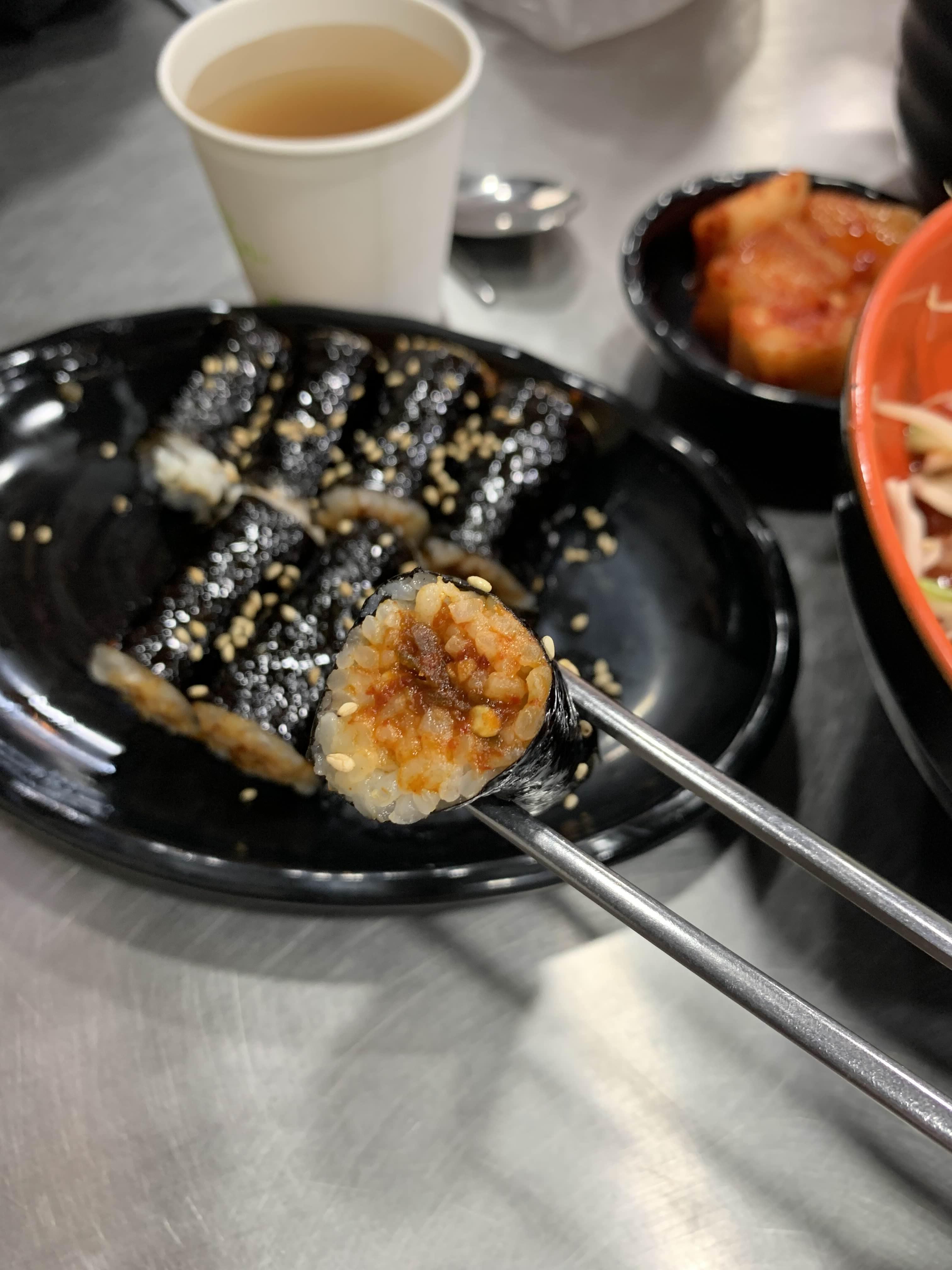 우선 땡고추김밥을 하나..... 맛보는데, 상당히 맛이 괜찮음! 고추장아찌가 들어간 듯 한 식감이다.