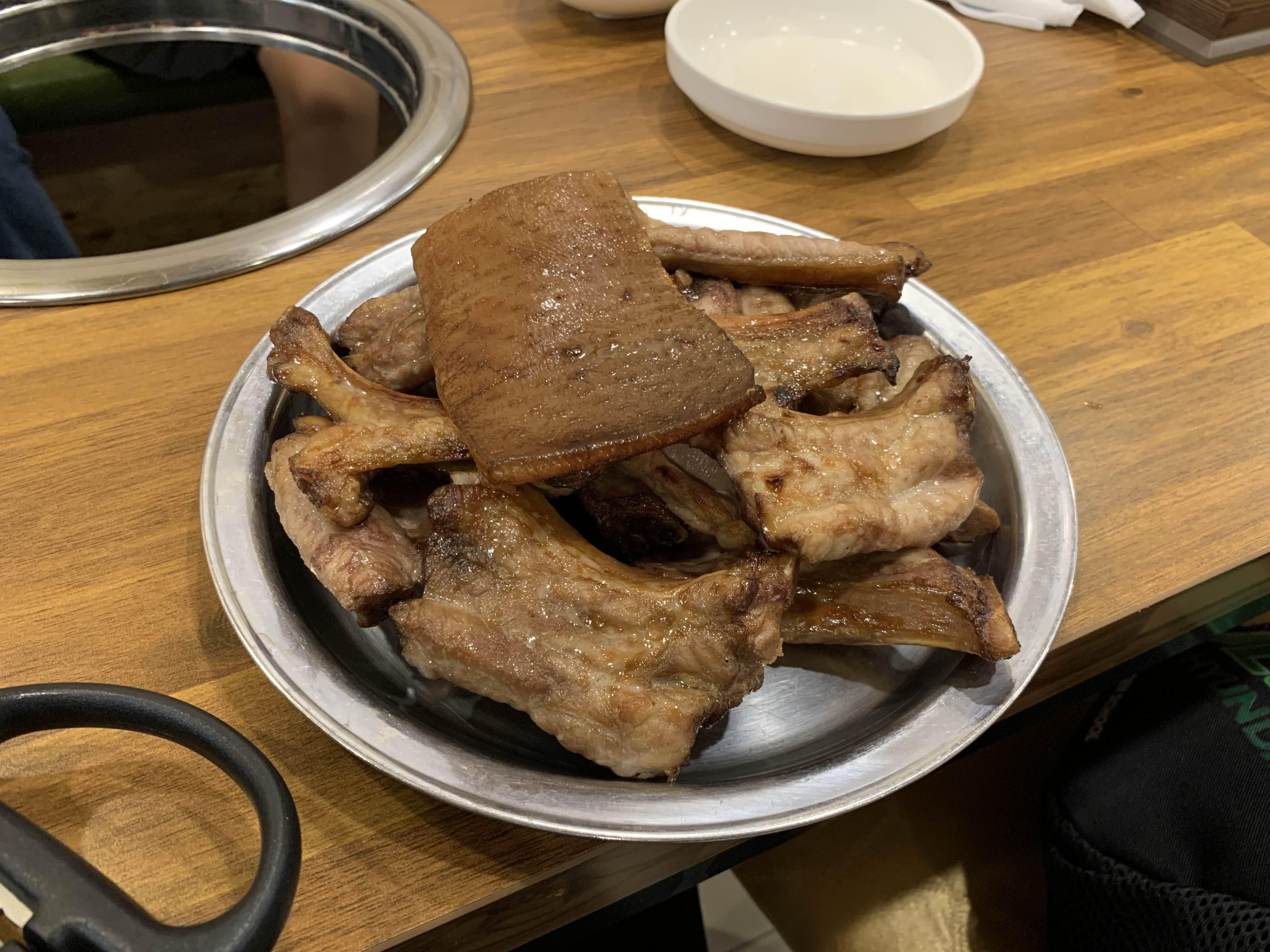 그리고 갈비가 나왔습니다. 갈비 위 껍데기는 기본 서비스로 나온 껍데기!!