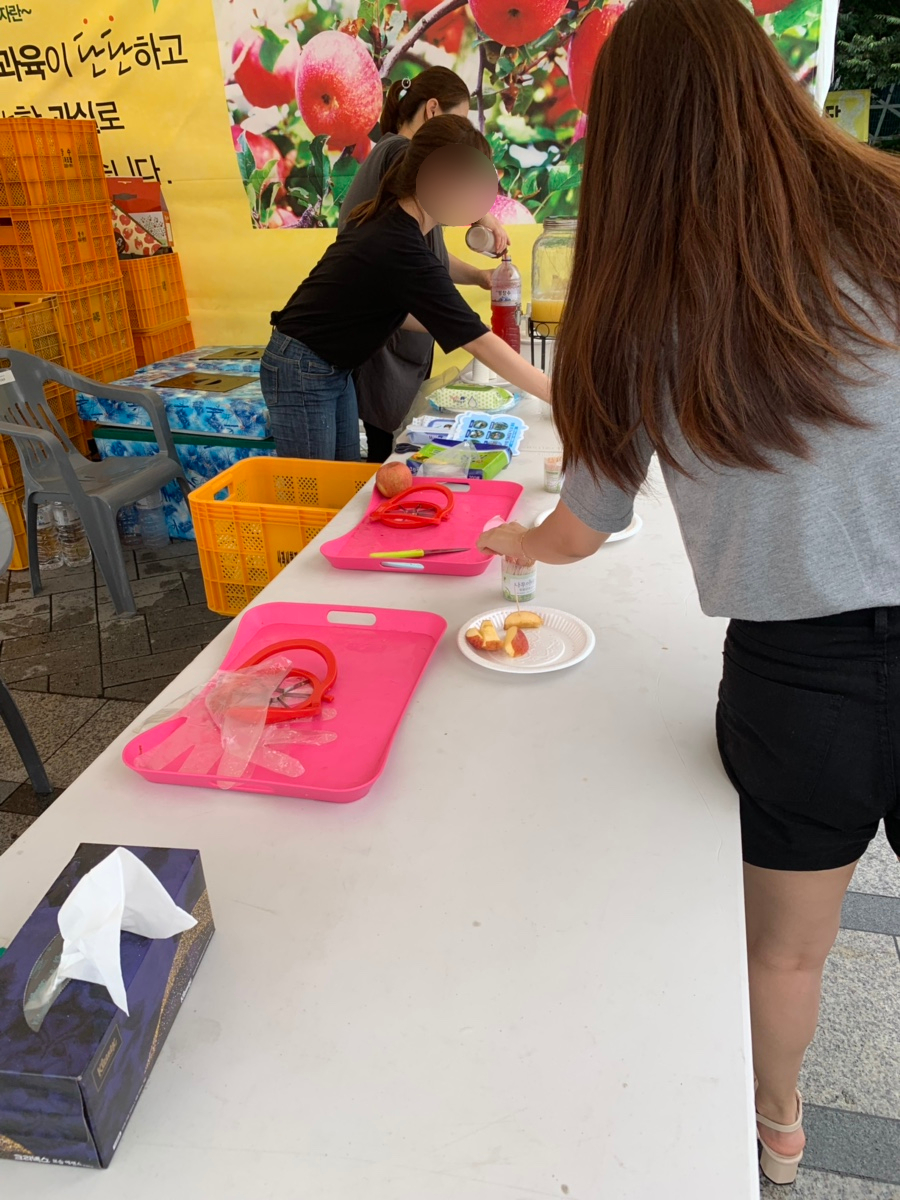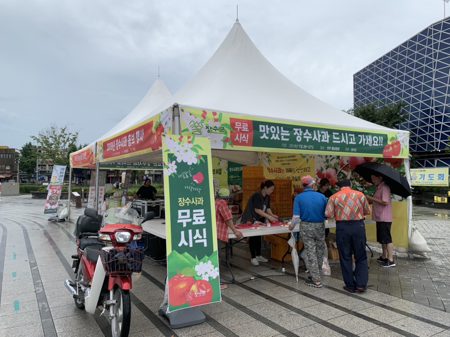 주말이면 전북대 대학로를 자주 놀러 가는데... 오늘은 자전거 타기 좋은 날씨라 한옥마을로 이동했습니다. 남부시장 천변 주차장에 주차하고 준비해온 자전거로 이동하는데.... 이동하는 길목?(풍남문 광장)에 장수군에서 장수 사과 시식행사를 진행하더군요. 장수군은 이런 홍보를 적극적으로 진행하는 거 같더군요, 전주 월드컵 경기장에서도 '장수군의 날' 만들어 장수군 특산품을 홍보하던 게 생각나네요.