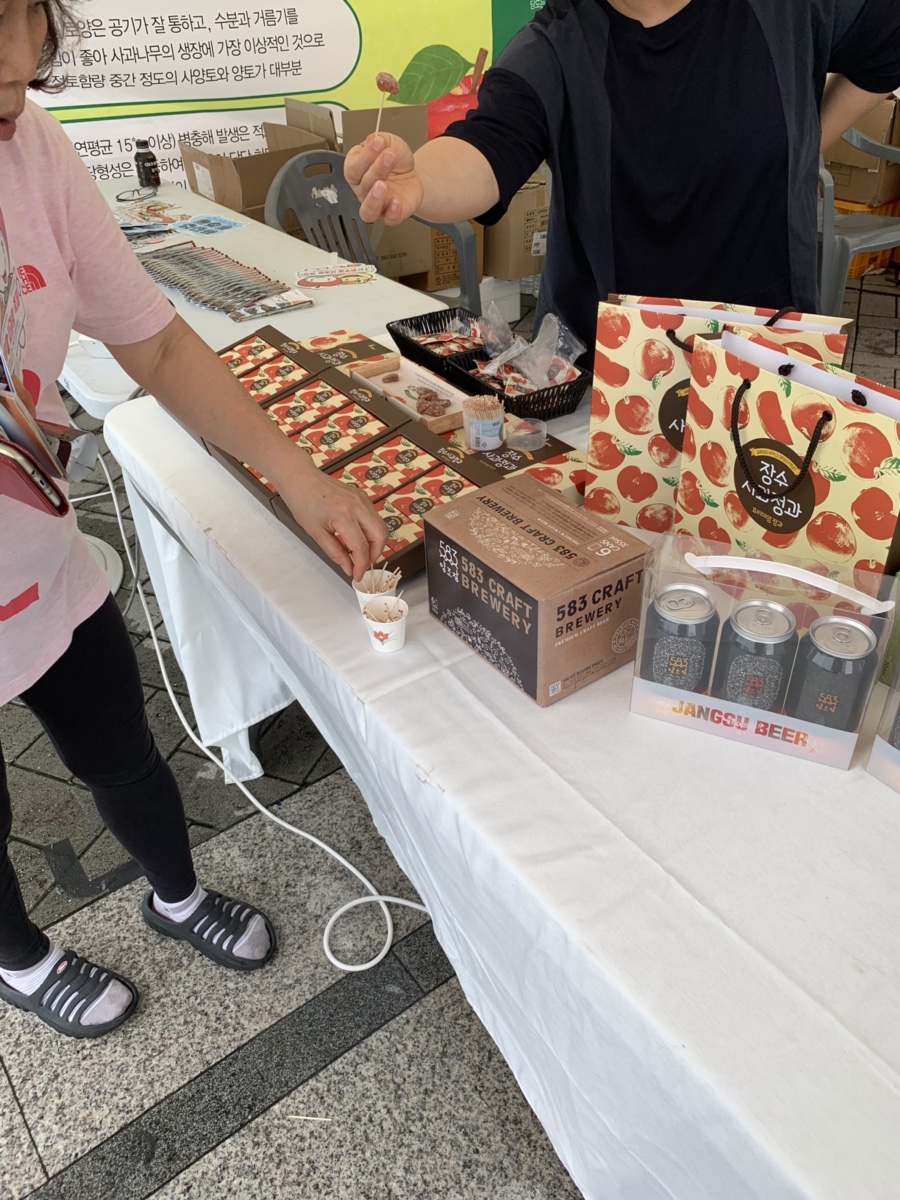우선 장수 사과 정과(사과를 말려서 만든 제품)으로 말랑말랑 젤리 식감이고 사과의 단맛이 응축되어 있죠. 아이에게 주었더니.... 안 먹네요;;; 너무 달아서 그런지 맛없다고;;; 나에게 주네요. 난 맛있던데^^ 그래서 하나 더 시식해보았네요. 집에서 사과 정과를 검색하니, 판매하는 곳도 없고 사과 정과 자료도 안 나오네요. 외부에서 홍보는 잘하시는데, 인터넷 홍보나 판촉은 잘 이루어지지 않나 보네요. 장수군청에서 운영하는 장수몰(https://www.xn--352bl9k1ze.com/)에서도 사과정과를 판매하지 않네요. 아직 시판품이 아닌가 봅니다.
