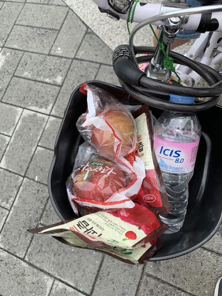 가장 맛있게 먹은 건 사과주스입니다. 내용물이 99% 사과인데.... 나머지 1%는 머지? 암튼 아이에게 주었더니!!! 쌍따봉이라고 하네요. 사과와 사과 즙을 시식하고 한옥마을로 향하려는데, 행사 상품으로 사과와 사과 즙을 주셨네요. 행사 상품을 자전거 바구니에 싣고서 한옥마을을 구경하였네요. 더워지고 달달한 게 당기면 아이가 사과 즙을 달라고 해서... 한옥마을 다니며 맛있게 잘 먹었습니다. 그리고, 부채도 나누어 주었는데, 더운 여름에 요긴하게 잘 사용했네요.