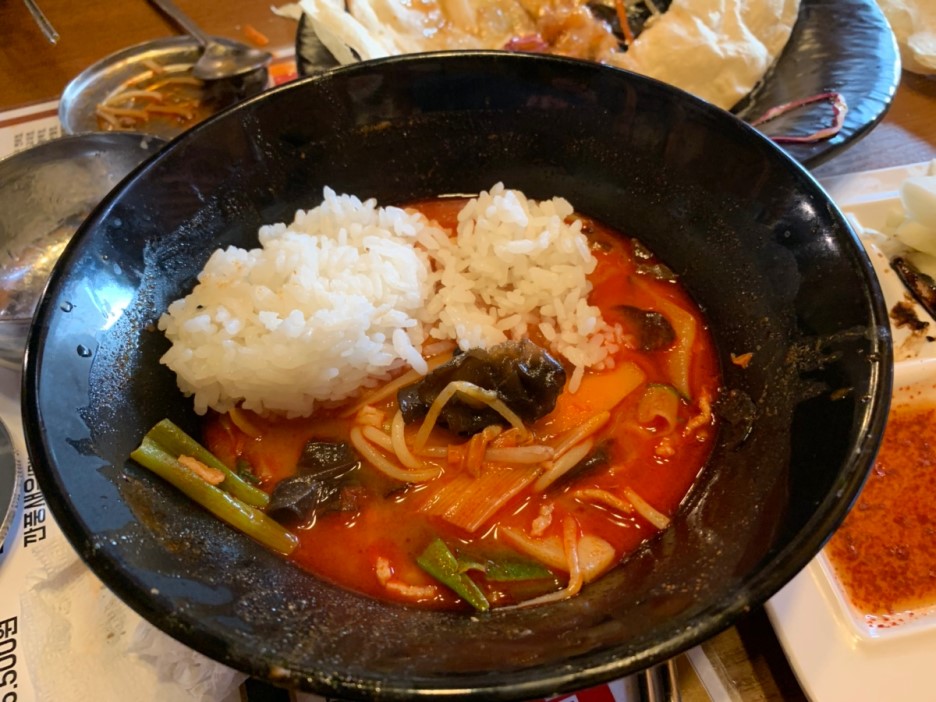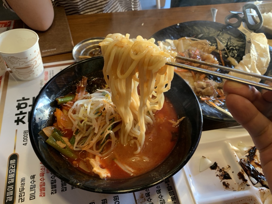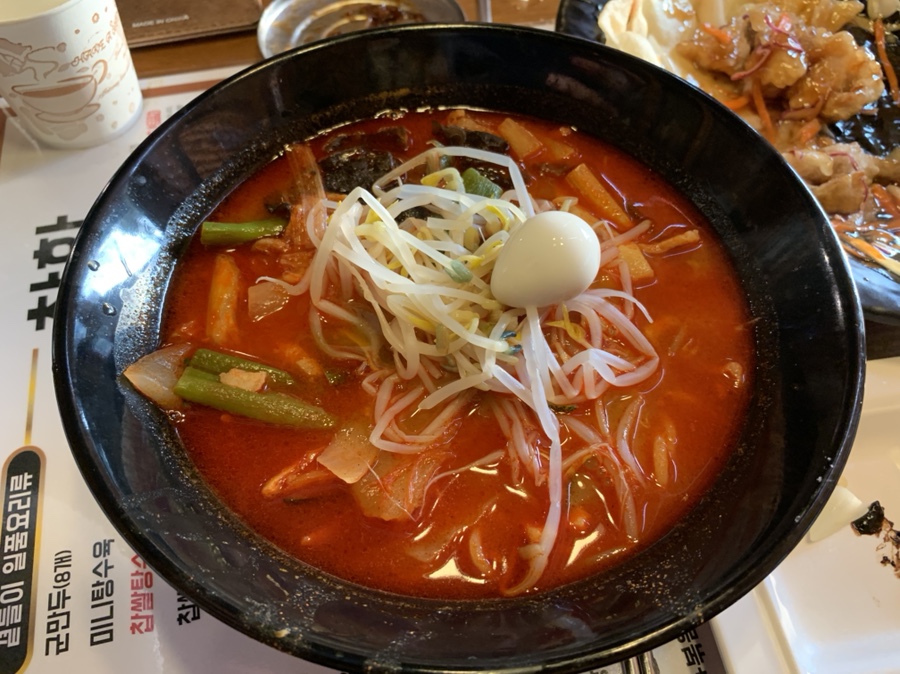 짜장면이 생각보다 양이 적어서, 추가 메뉴 5,900원 짬뽕을 주문했습니다. 짬뽕도 짜장 그릇과 동일한 크기의 그릇에 나오네요. 양이 적어서 아쉬움이 있지만, 국물은 얼큰(좀 매움)해서 좋았습니다. 짬뽕을 먹다가 양이 적어서 공깃밥을 주문해서 국물에 말아서 먹었는데... 너무 매워서 공깃밥과 어울리지는 않더고요. 이 짬뽕보다는 약간 덜 맵고, 양이 일반 짬뽕과 비슷해지면 좋겠네요. 짜장이나 짬뽕은 단일 메뉴만 먹기야 양이 상당히 적습니다.