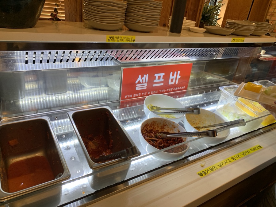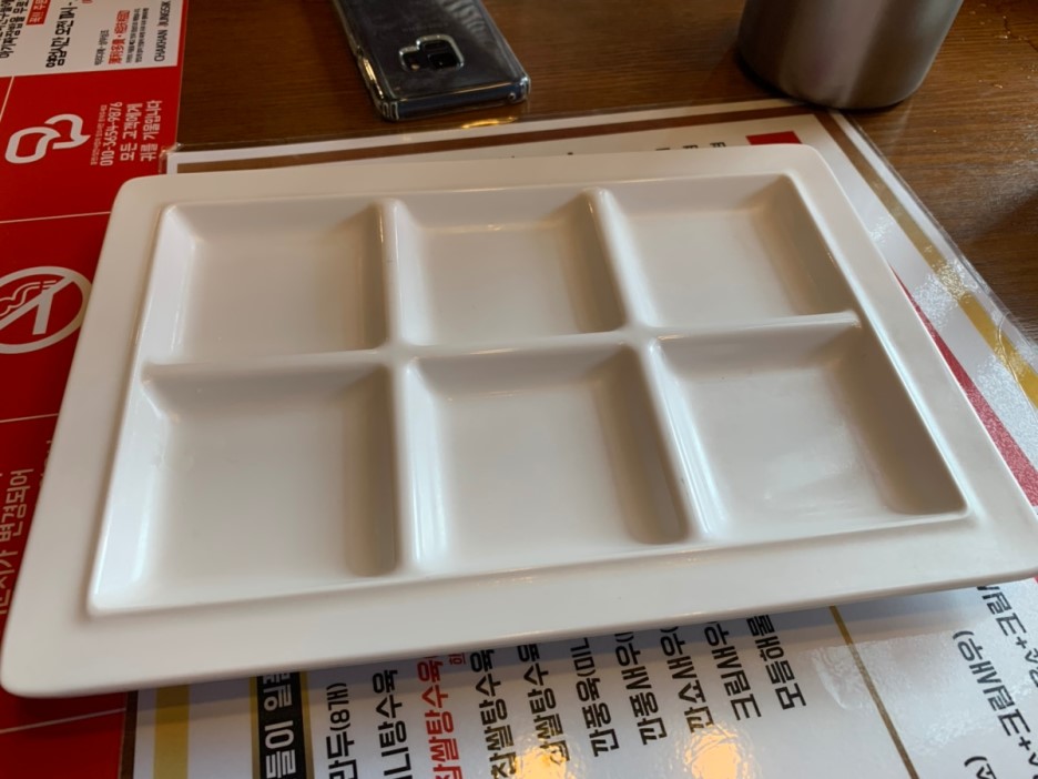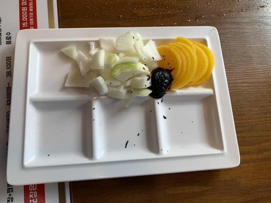 음식을 주문하고 잠시 후 밑반찬이 나오네요. 밑반찬으로 빈 접시가 나오는데.... 셀프바에서 반찬을 가져다가 먹는 방식이네요. 기본 밑반찬(단무지, 양파, 춘장)은 나오고, 추가 반찬을 가져다 먹는 방식인데.... 셀프바에서 반찬을 마음껏 가져다 먹는 방식이라.... 기대에 부풀어? 셀프바에 들렀는데... 김치는 없고, 단무지, 양파만 있었네요. 무말랭이는 안 좋아해서 페스.... 깍두기 배추김치는 없어서 맛은 못 봤네요.