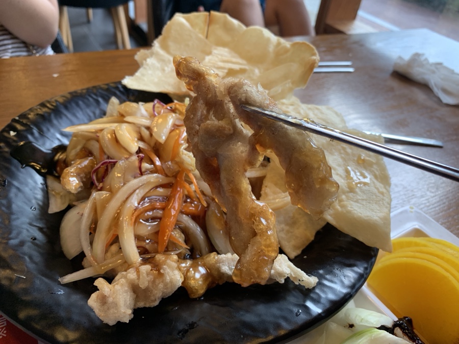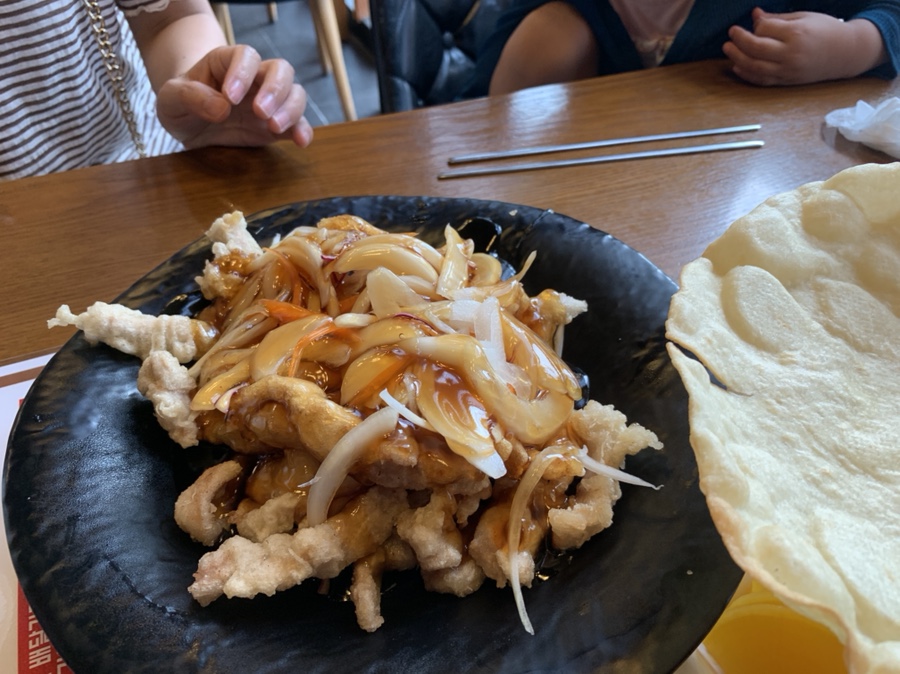 주문한 탕수육이 먼저 나오네요. 탕수육은 바삭하게 생긴 뚜껑이 덮어서 나오는데.... 식감은 좀 눅눅하고, 맛은 아무런 맛이 없네요. 살짝 밀가루? 향이 났습니다. 건강한 맛이라 생각하고 아이에게 조금 주었더니.... 안 먹네요. 맛없는 뚜껑을 열고, 탕수육을 흡입하려는데.... 탕수육이 겉은 바삭? 속은 부드러운 맛일 거라 생각했는데 겉과 속이 모두 부드러웠네요. 부드럽다기 보다 눅눅한 느낌이었습니다.