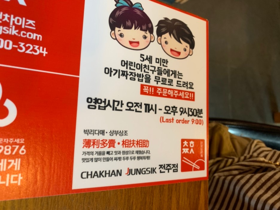 메뉴판에 5세 이하 어린이는 아기 짜장밥을 무료로 드려요?라는 문구가 있네요. 5살 아이가 있어서 아기 짜장밥을 주문하니... 아이에게 몇 살이냐고 물어보고, 아이는 5살이에요!!! 대답하니.... 5세는 지급 안 한다고 하시네요.^^ 그래서 주문을 짜장면, 찹쌀탕수육(소)를 주문했습니다. 건물 외벽에 짜장면 2,900원이라는 플래카드가 붙어있어... 짜장면이 메인 같아서 주문하였네요. 가격은 짜장면 2,900원, 탕수육(소) 12,900원, 나중에 주문한 짬뽕 5,900원을 주문했습니다.