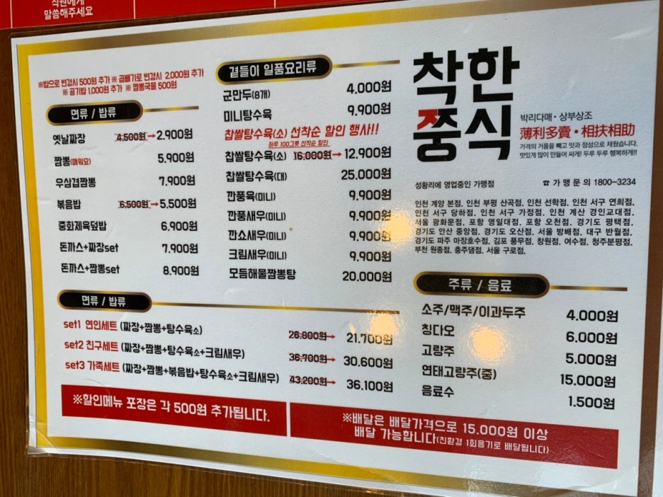 조그마한? 건물에 여러 가지(샤브 바니, 홍익, 월남쌈 샤브, 의령소바) 프랜차이즈가 집합한 식당에 방문하였습니다. 식당 처음에는 2층에 샤브샤브 식당이 위치하였고, 1층에서 샤브 식사한 손님에게 음료를 제공하는 카페를 운영하였는데... 지금은 종합 프랜차이즈 식당 몰? 이 되었네요. 가족과 저녁식사를 해결하기 위해 최근에 오픈한 착한 중식을 방문하게 되었네요. 간판을 착한 중식?으로 봤는데, 착한 중식이네요;;