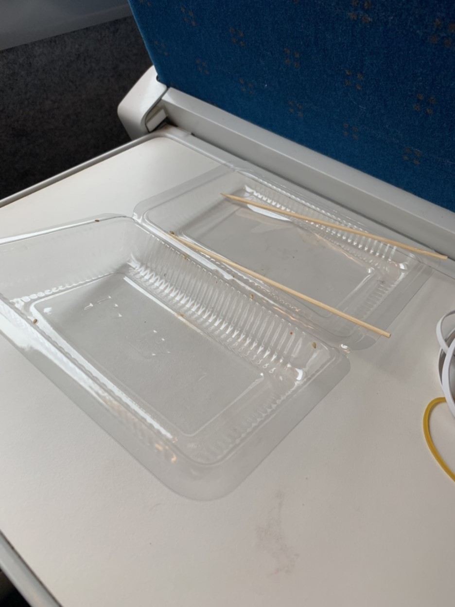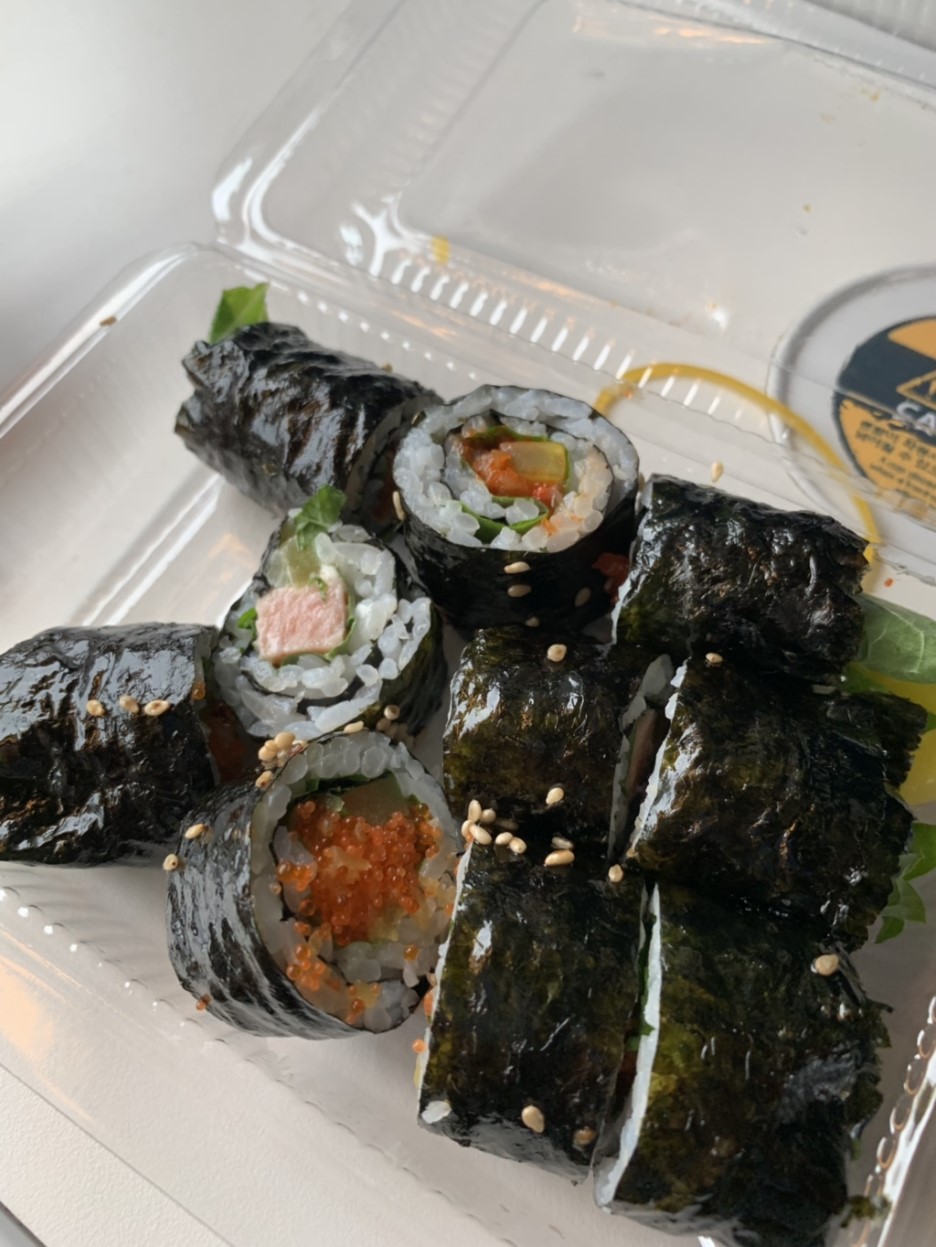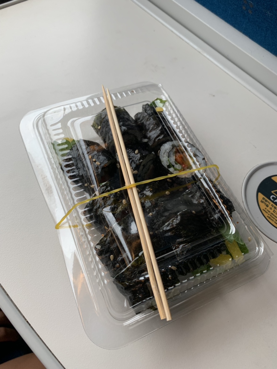 자리에 앉아서 바로 김밥을 꺼내고 아이는 날치알을 먹는데... 맛있다고 하네요. 저도 하나 먹어보니 맛은 괜찮았습니다. 다만, 너무 작아서 맛을 느끼기 전에 삼켜버린다는 게 단점이네요. 김밥이 조금 더 커졌으면.... 좋겠네요. 이거 10~15줄은 먹어야 한 끼 식사가 되겠네요. 김밥을 어느 정도 구입하면 국물이 좀 나왔으면 좋겠네요.