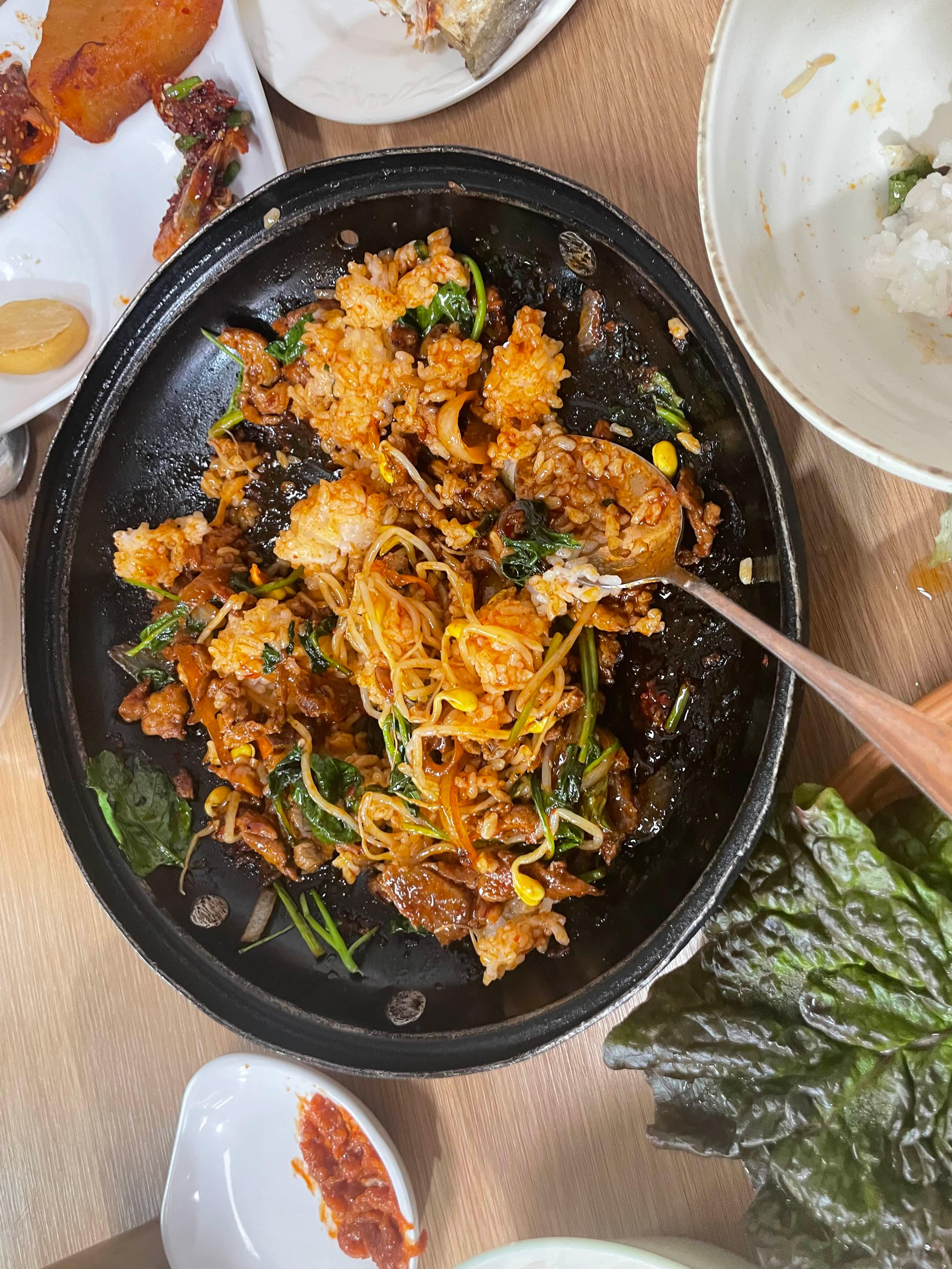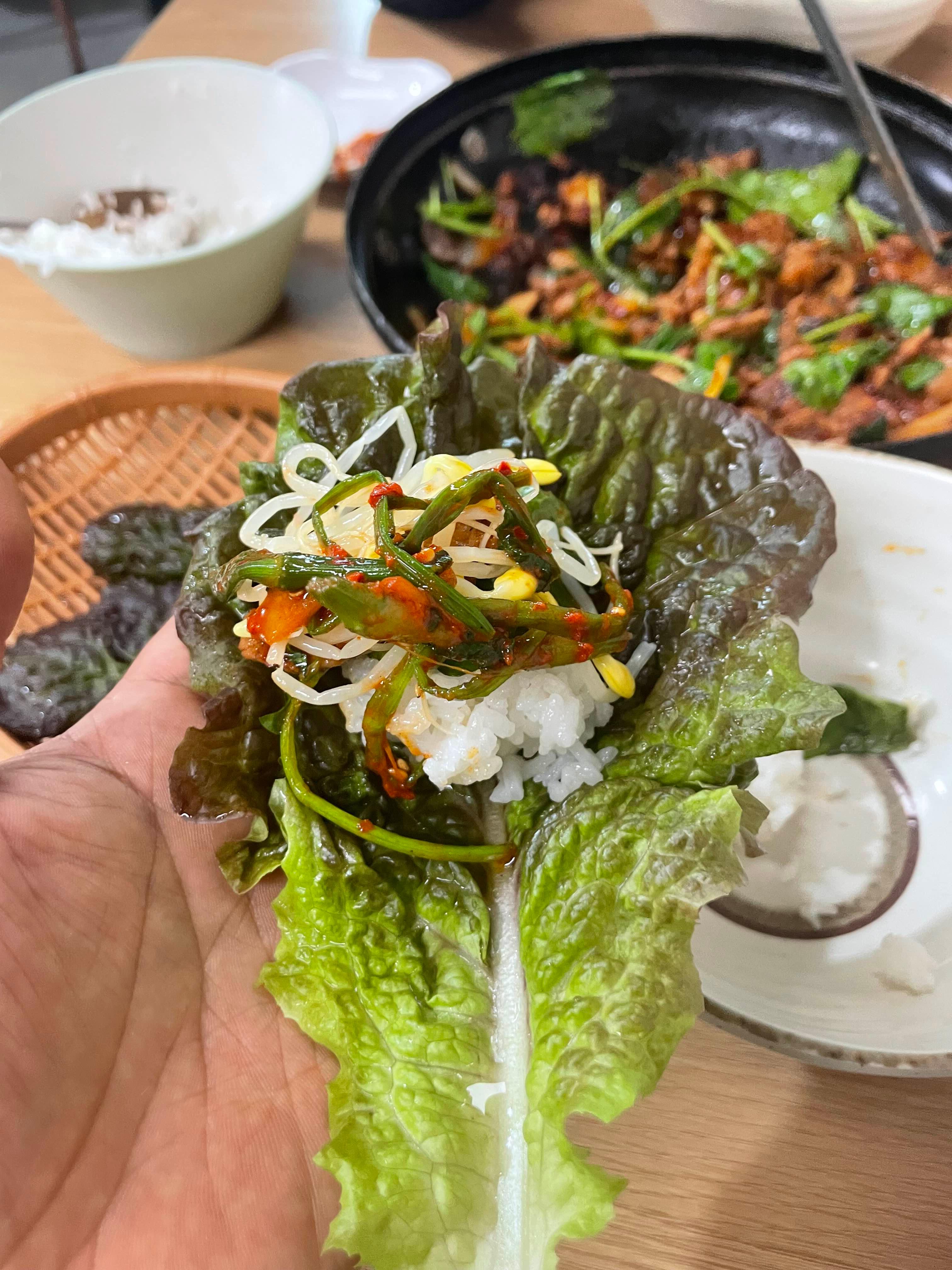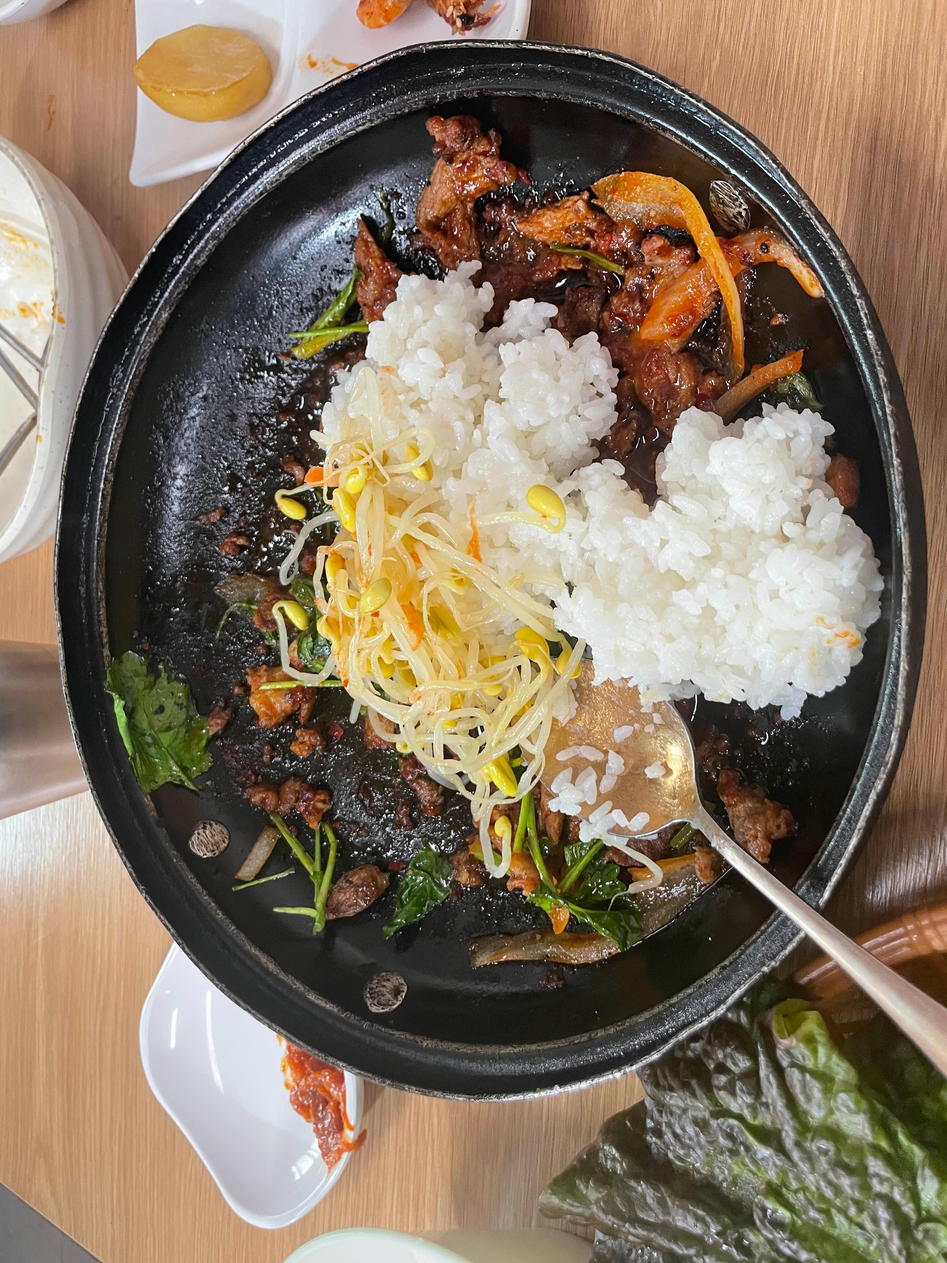 제육을 어느 정도 먹고서 비벼 먹으라는 안내문에 따라.... 콩나물만 추가해서 밥을 비비기 시작한다.