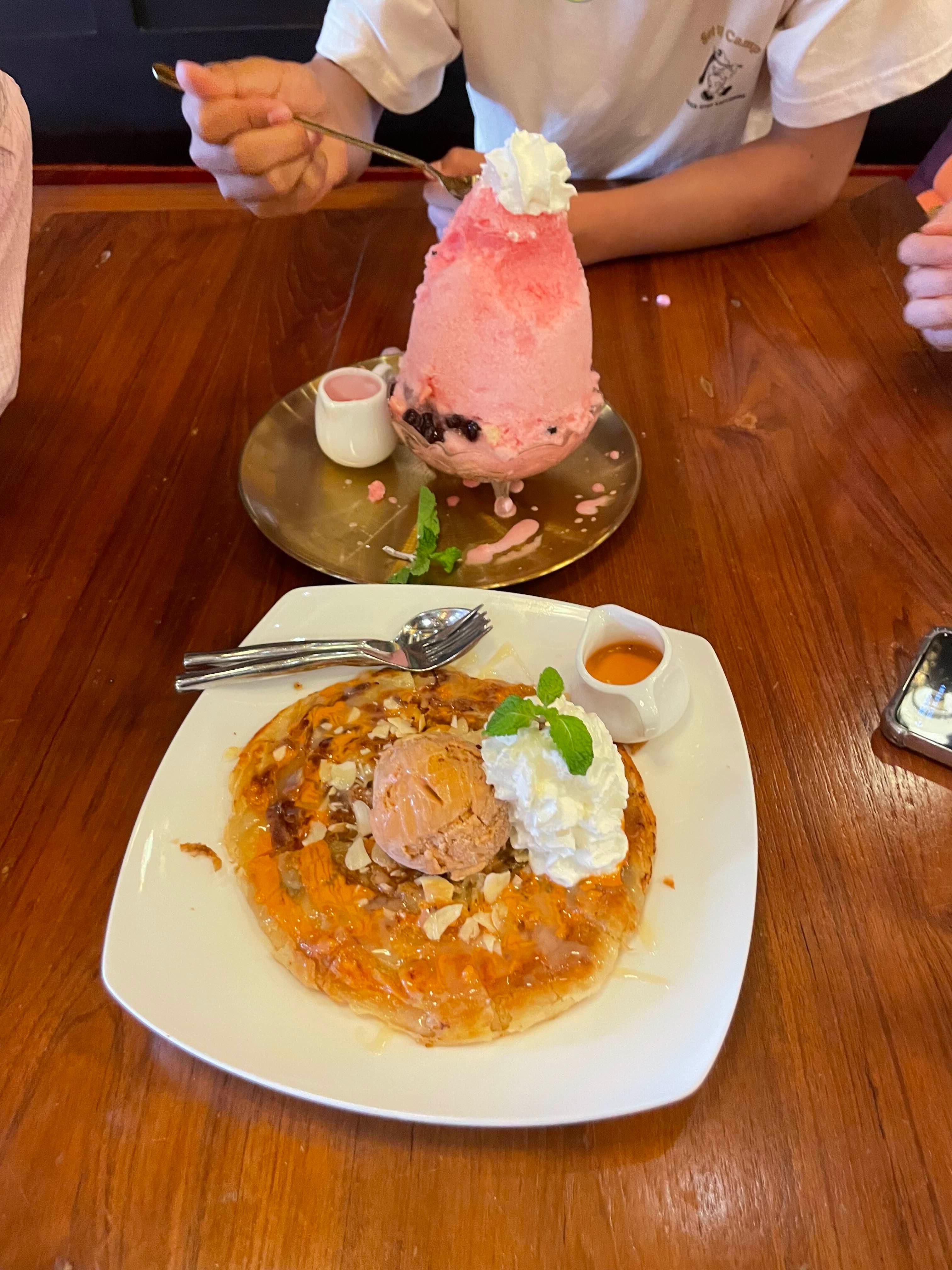 대부분 식사를 주문하는데... 식사는 250~300밧 정도인데... 수상보트와 기찻길 시장을 둘러보면서 식사를 할 수 있을 거 같아서... 간식으로 빙수와 디저트를 하나씩 주문했다. 가격은 대략 하나당 150밧 정도로 기억!