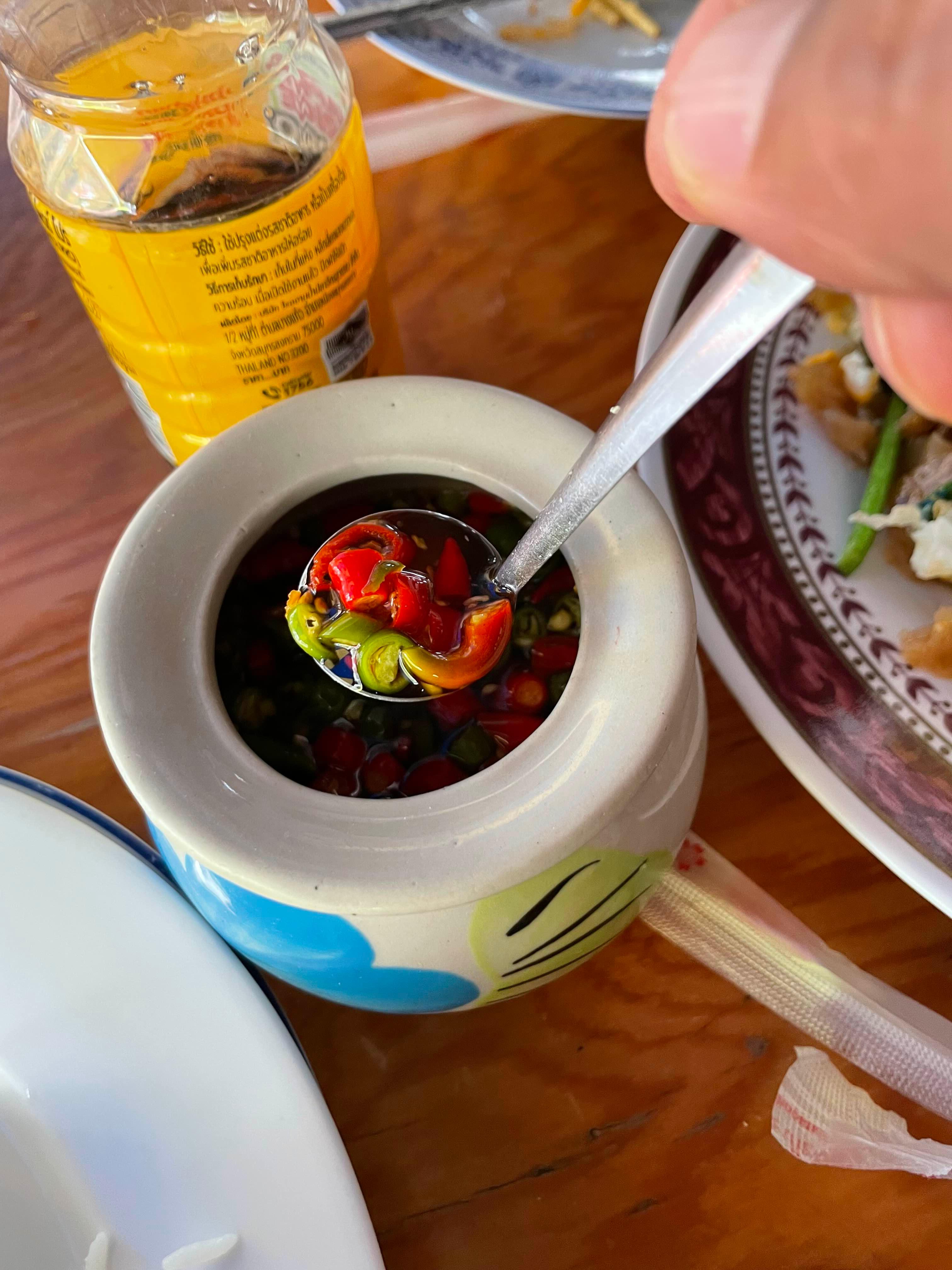 고추를 넣어 절인 젓갈을 한 스푼!