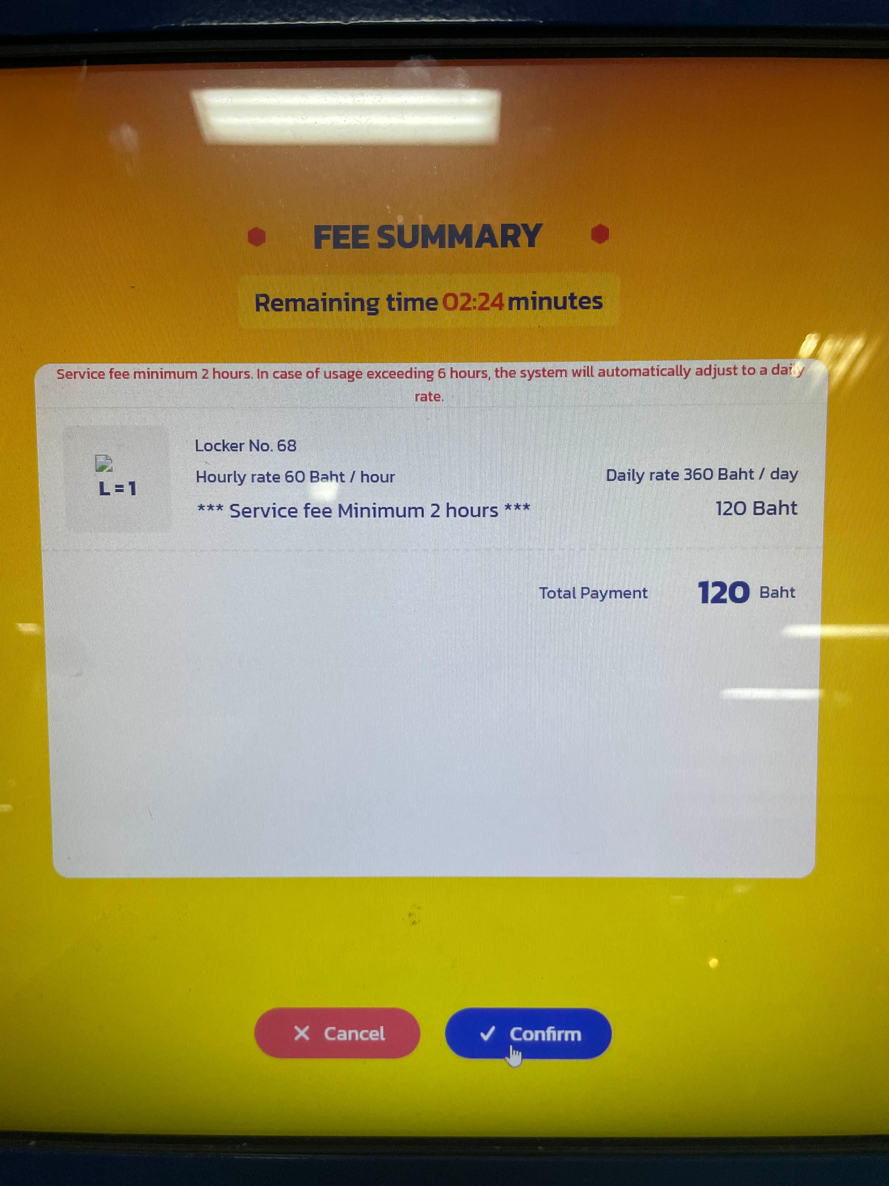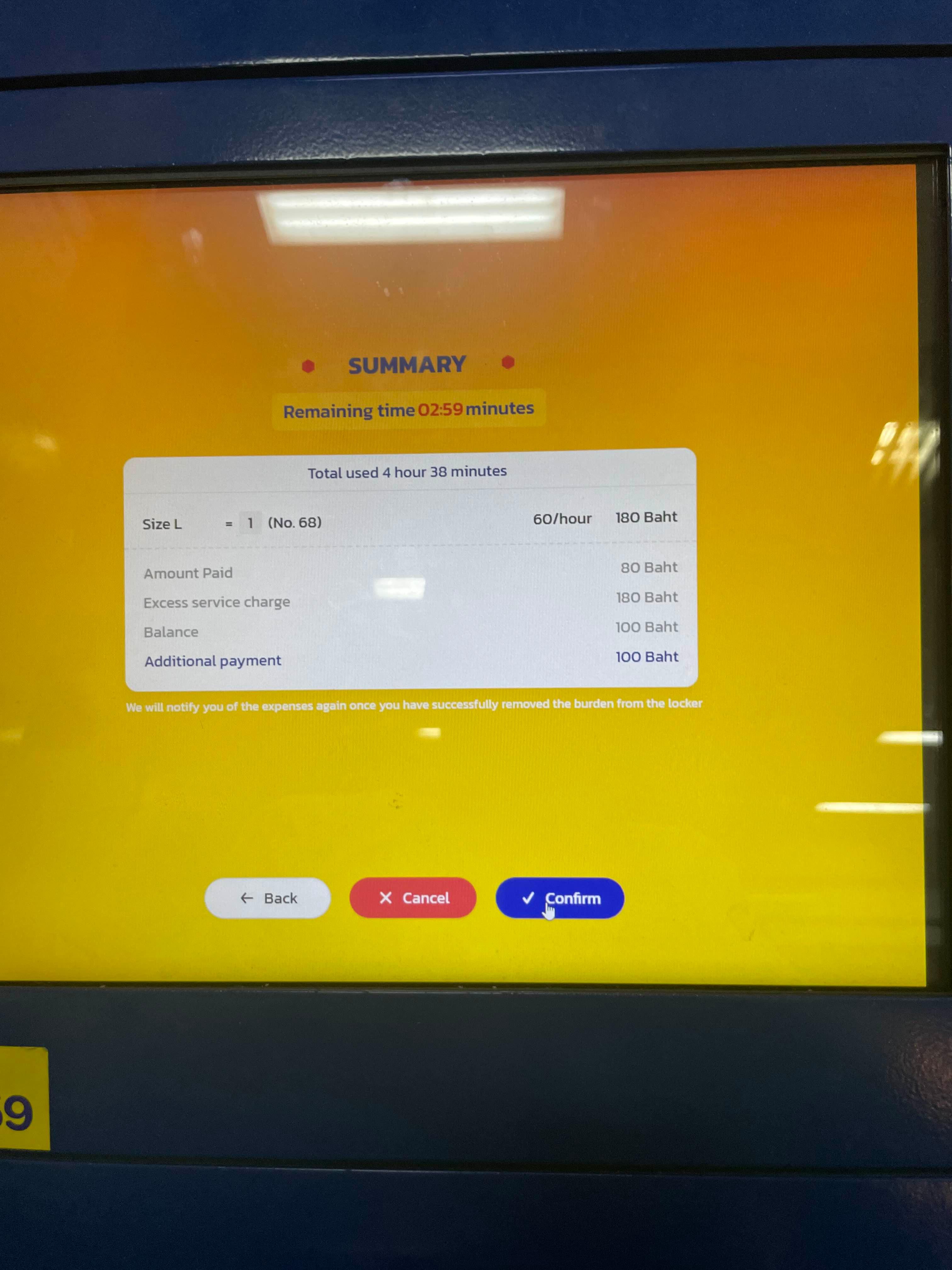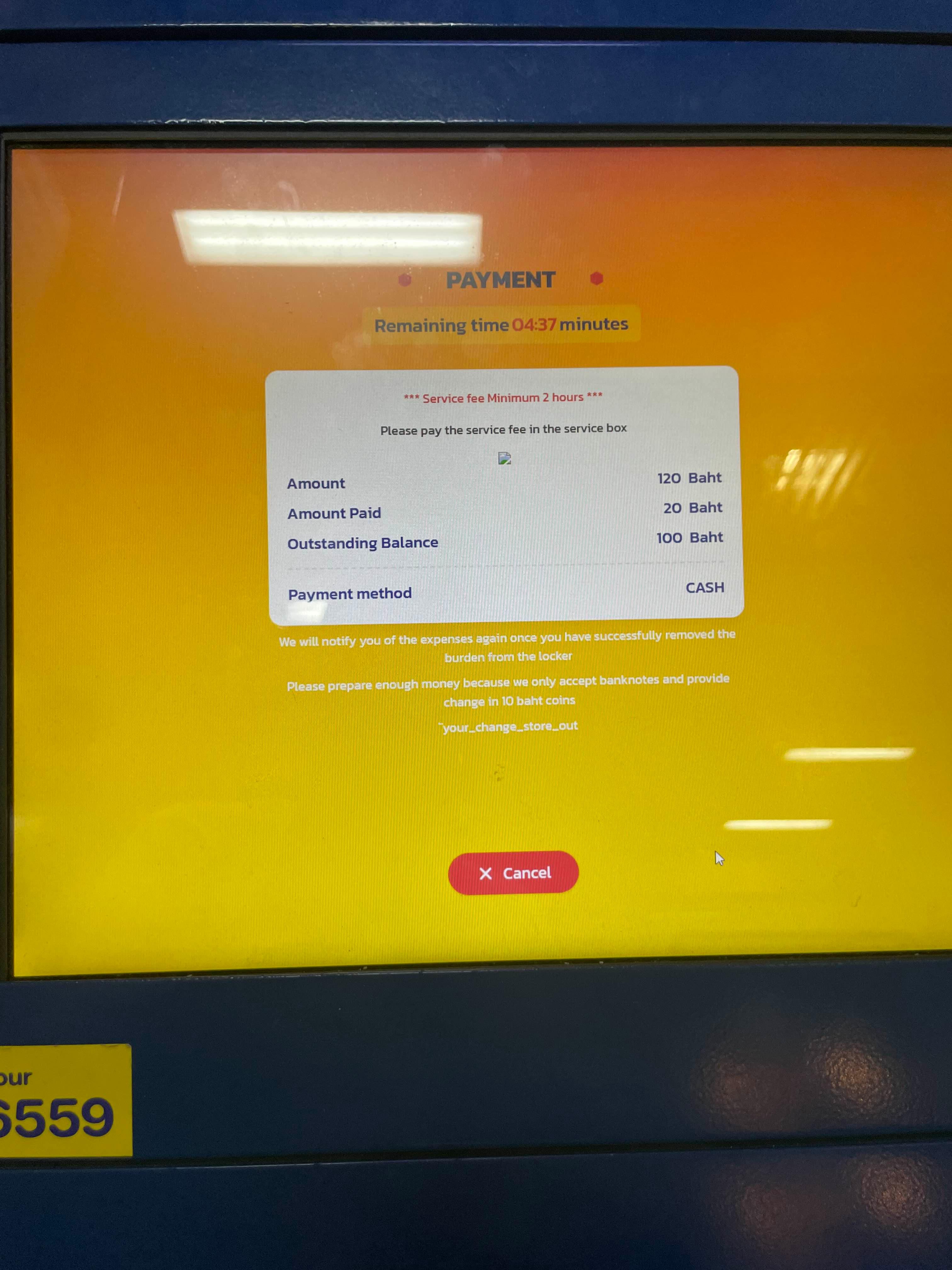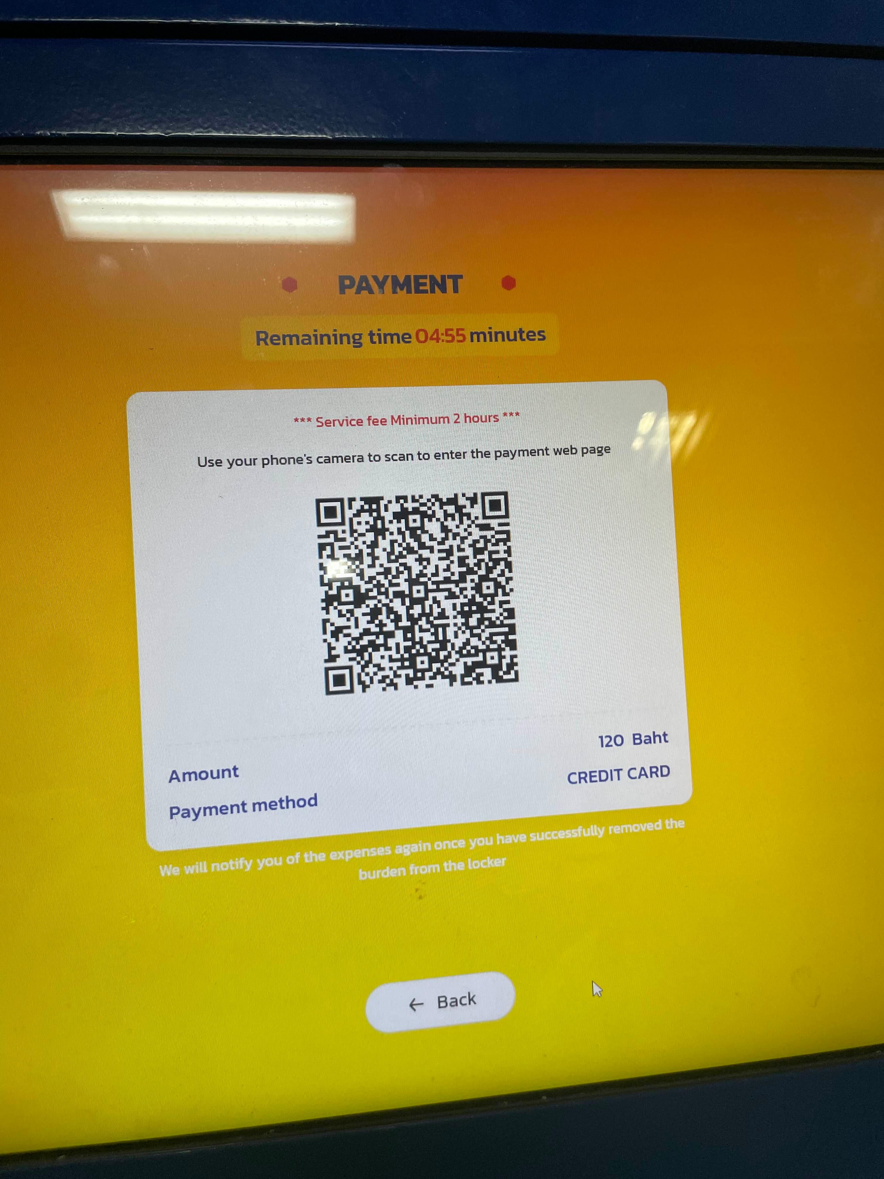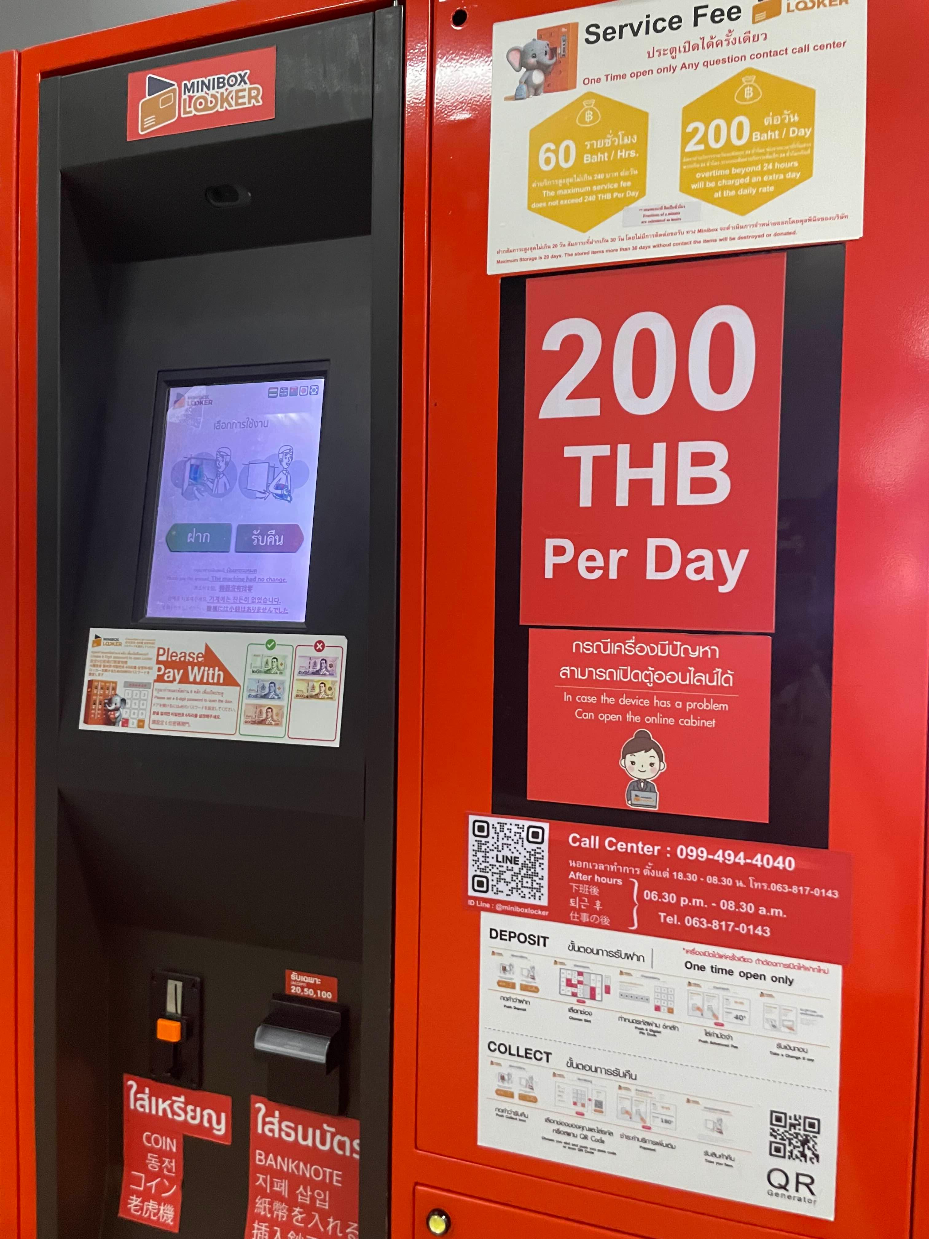 짐 보관을 위해서는 기본 2시간 요금(120밧) 입금하고 잔여금액 돌려받거나, 추가 시간에 대해서 추가입금 해야 한다.