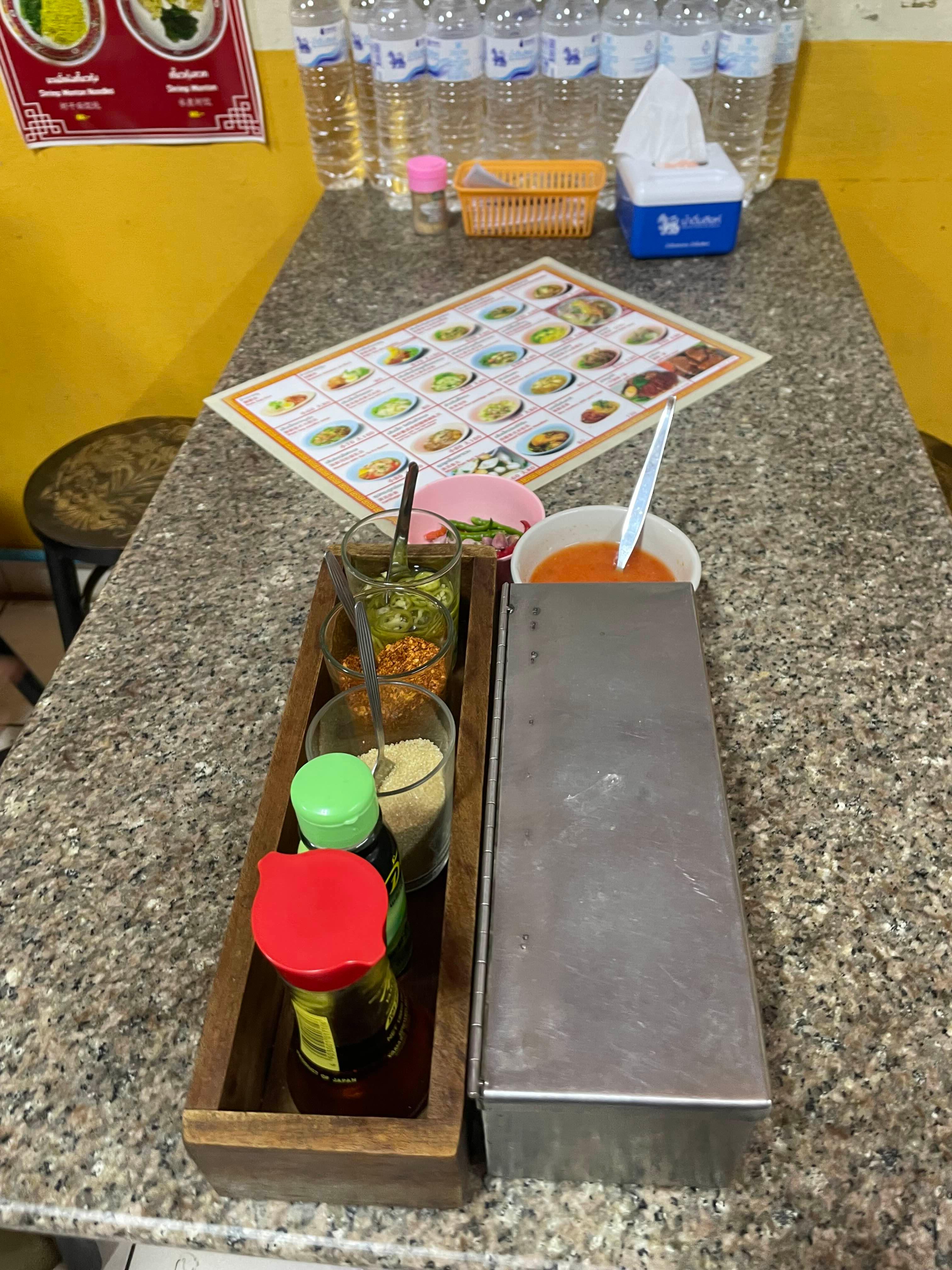 식당 테이블에는 6가지 소스통과 고추와 마늘 2가지 식재료가 준비되어 있다.