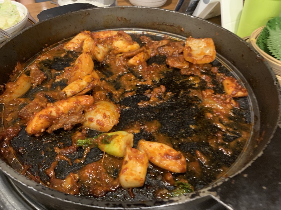 기다리고 기다리던 주메뉴 갑오징어 삼겹살 불고기가 나왔네요. 생각보다 양이 적어서 깜놀;;; 갑오징어는 두툼해서 질길 것 같았지만 부드러운 식감이 좋았습니다. 다만, 삼겹살은 좀 질겼네요, 얇게 썰은 삼겹살인데 질기기도 하고, 오돌뼈가 맛이 있어서 쌈 싸 먹기에 불편했네요. 오돌뼈를 제거해서 먹었네요. 백운호수점에서는 갑오징어 보다 삼겹살을 더 맛있게 먹었는데.... 여기는 삼겹살은 아니었네요. 그리고, 양념이 바닥에 흥건했던 걸로 기억나는데 철판 하부에는 양념장이 거의 없어서.... 양념장이 좀 흥건하게 있으면, 그 양념장으로 콩나물만 비벼 먹어도 맛있는데... 좀 아쉬움이 남네요.