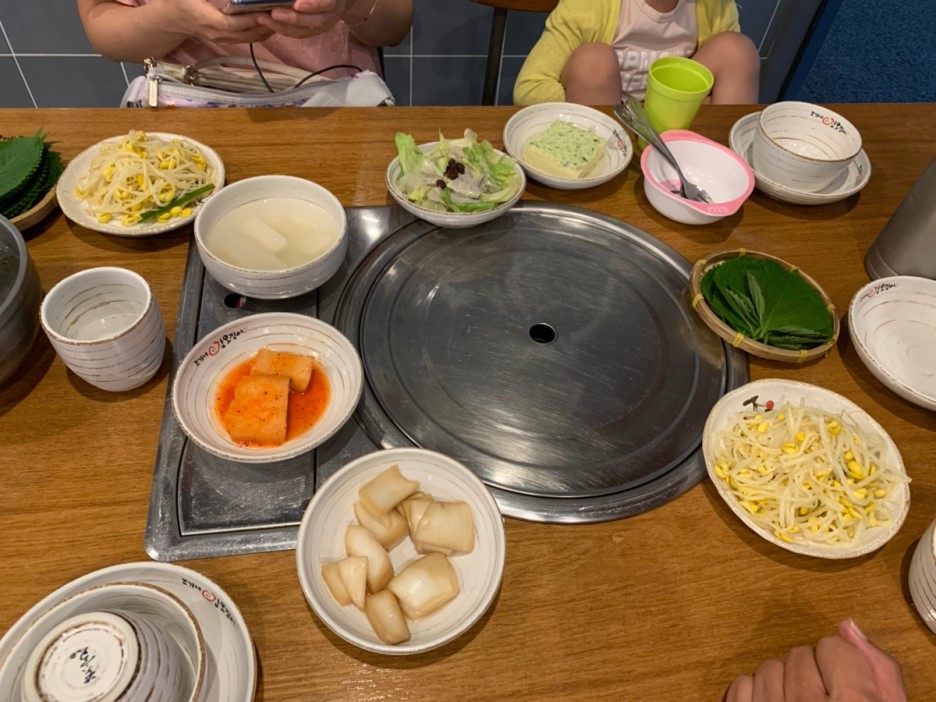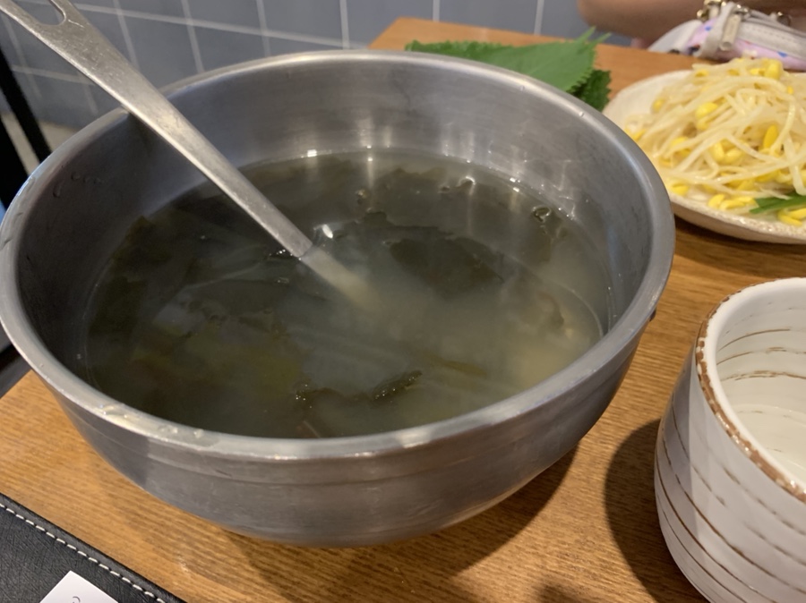 어른 3명, 아이 1명이라 갑오징어 삼겹살 불고기 중 49,000원 하나 주문했습니다. 가격은 저렴하지는 않지만, 부드러운 갑오징어에 삼겹살을 매콤하게 요리하여 콩나물과 깻잎에 맛있게 싸먹었던 기억이 있어서 기분 좋게 주문했습니다. 주문하고 밑반찬으로 양파 저림, 깍두기, 콩나물, 깻잎, 달걀찜 그리고 미역국이 나오네요. 아이는 미역국과 계란찜을 주고 메인 메뉴를 기다렸네요.