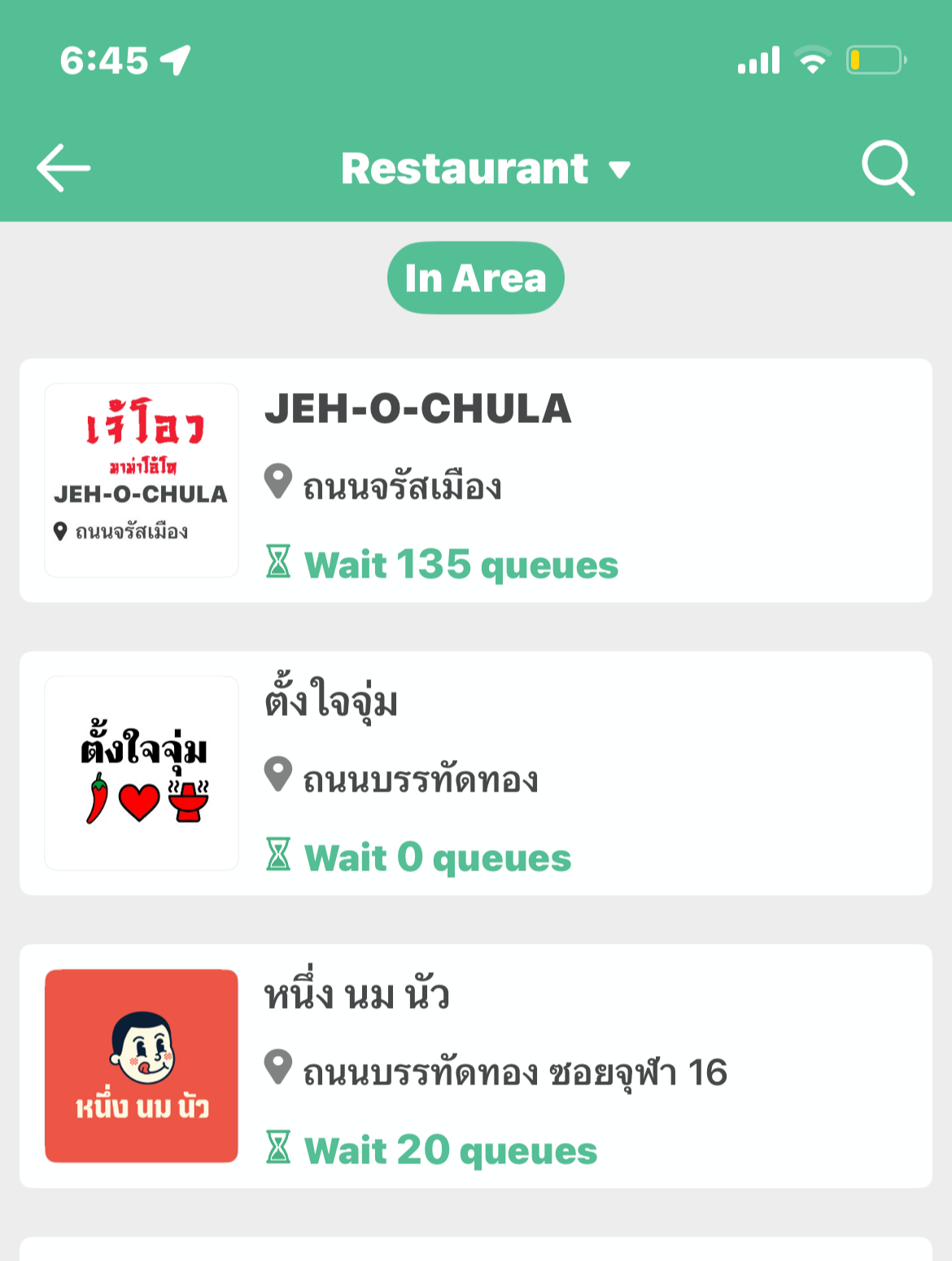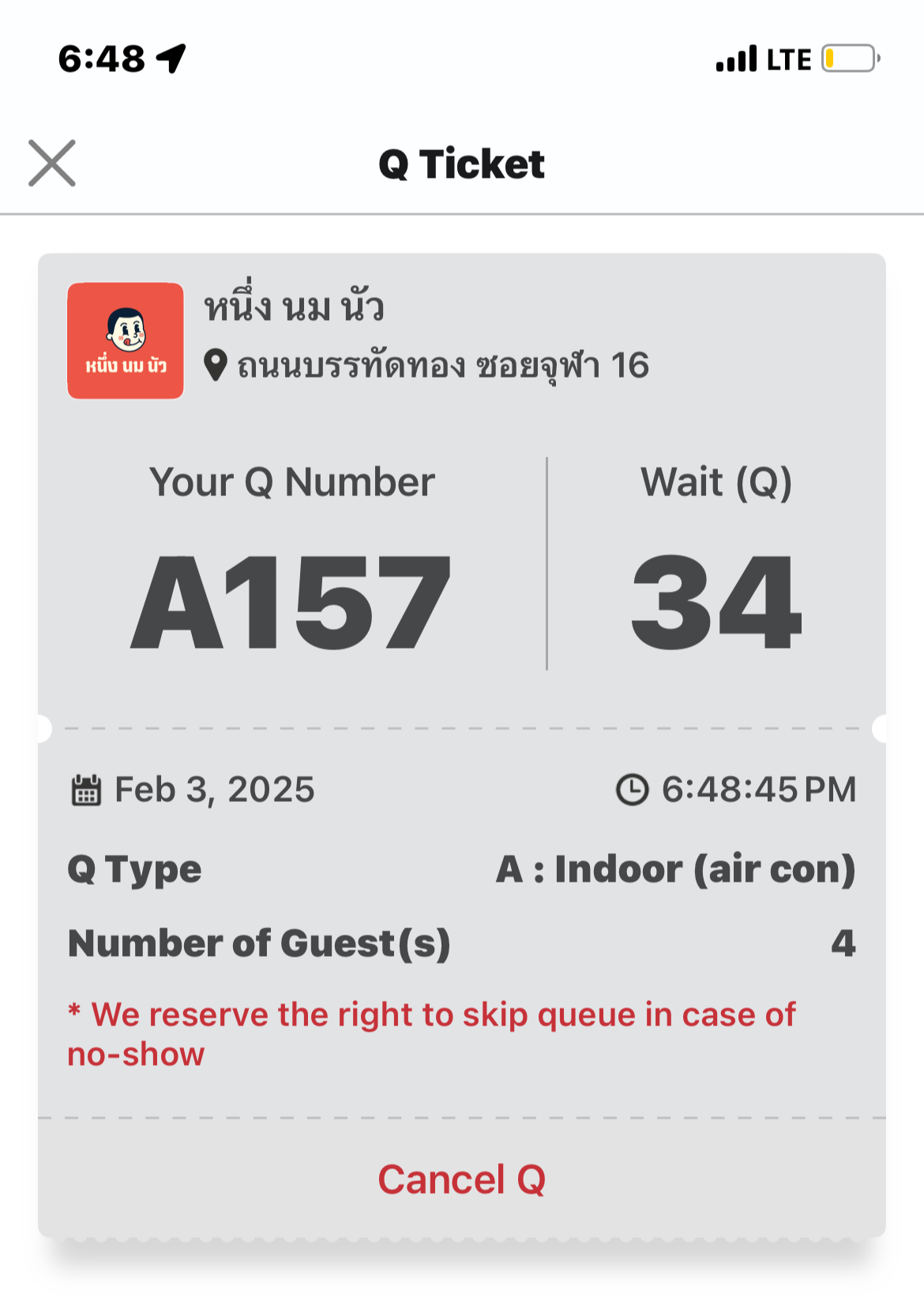 한국에서는 식당 대기는 테이블링 어플을 사용하듯이, 태국에서는 "QueQ" 앱을 사용한다. 참 편리하다.