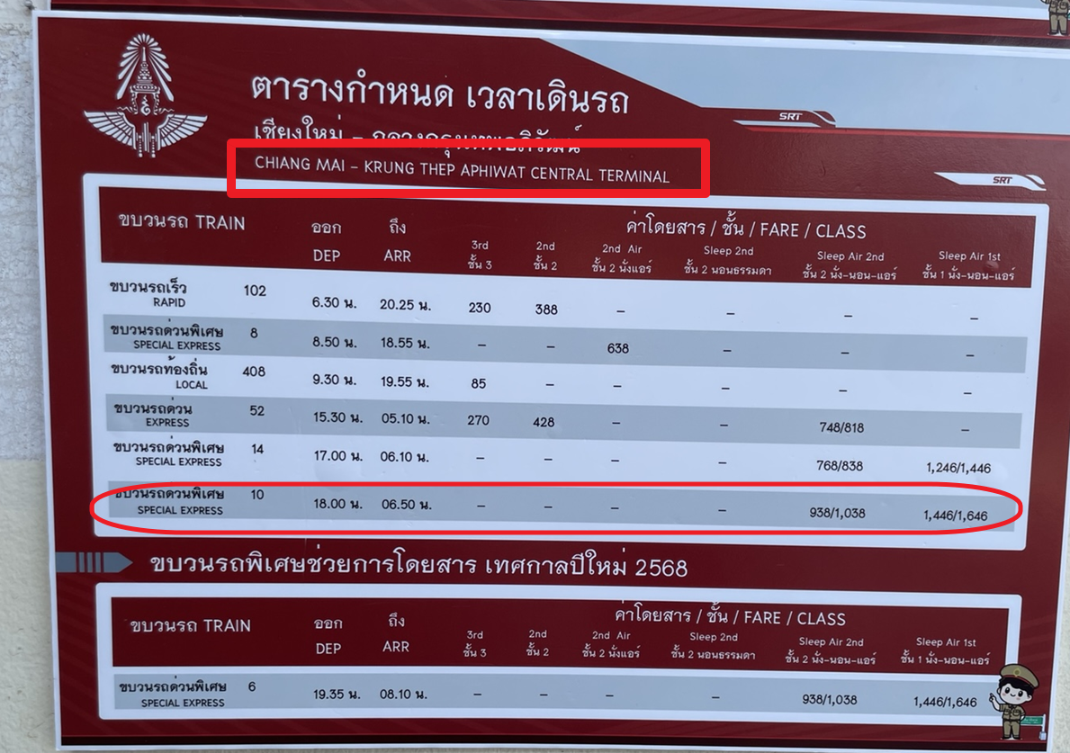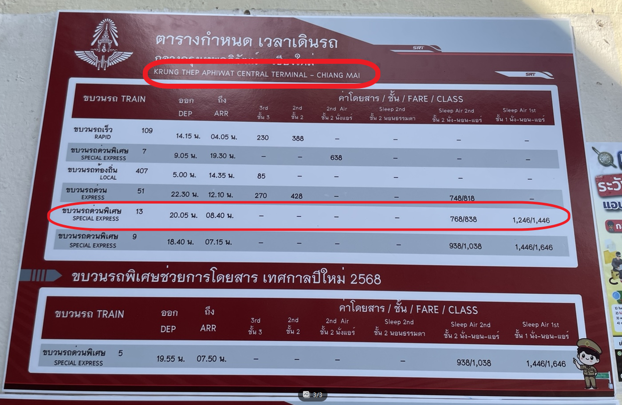 * 치앙마이는 역명이 치앙마이이지만 방콕은 방콕역이 아니라 "Krung Thep Aphiwat역"이며, MRT라인 "Bang Sue역" 연결되어 있다.