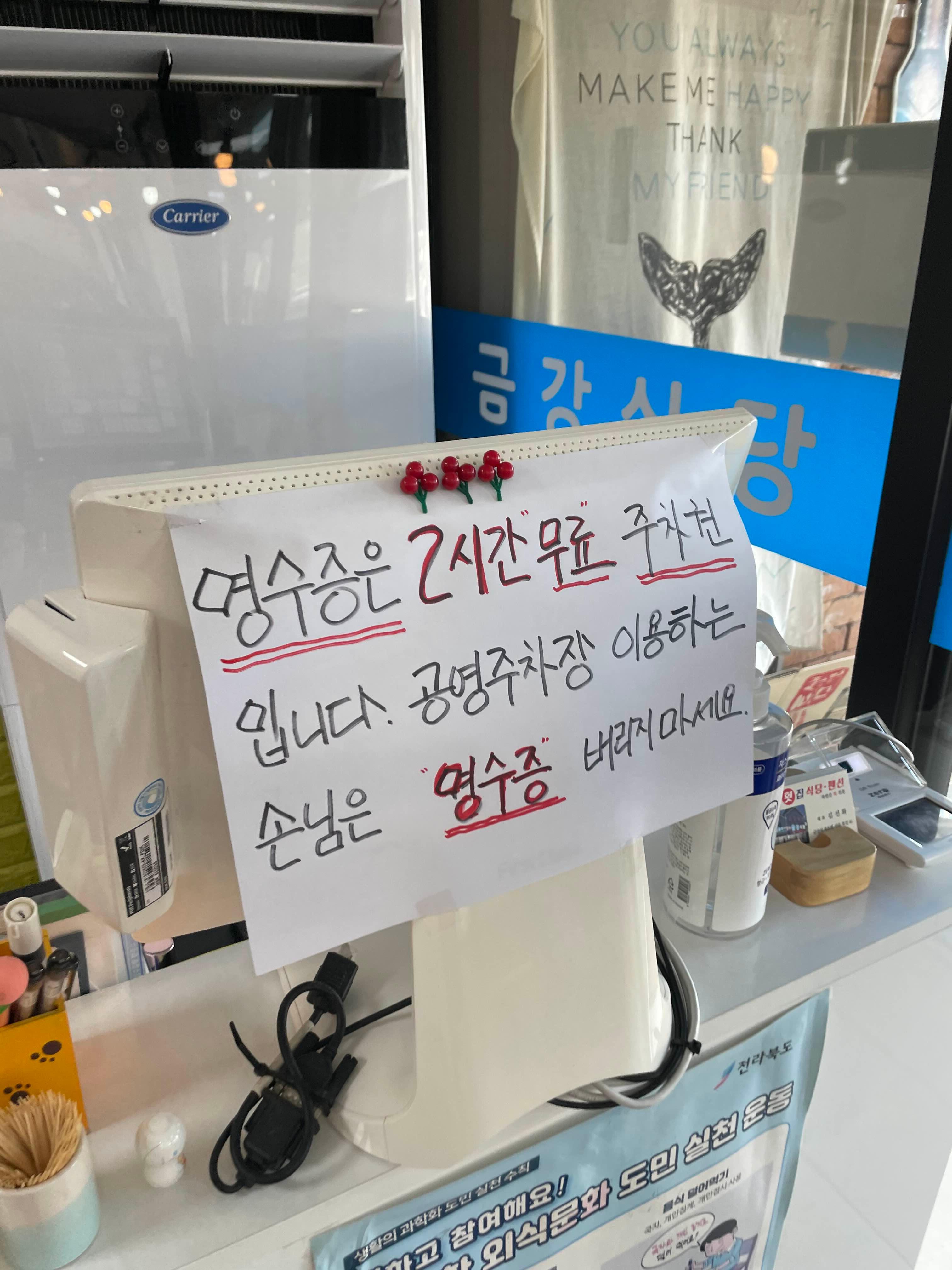 공용주차장은 1시간까지 무료이고... 1시간 초과부터 요금이 부과된다. 1~2시간 사이에는 식당 1만 원 이상 영수증을 제시하면 무료 주차가 가능하다.