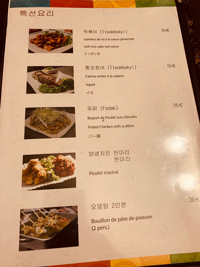 프랑스 도착하고 첫 식사하며 3번 놀랬는데!!! 주변에 식당이 없어서 첫 번째로 놀랬고, 한식당에 들어가 가격표를 보노 두 번째로 놀랬고, 마지막은 치킨의 맛에 놀랐습니다.^^ 내일은 스타킹 앞에 위치한 k 마크(한국 식료품점)에서 장 봐서 떡볶이를 만들어 먹어야 겠네요.ㅎㅎ