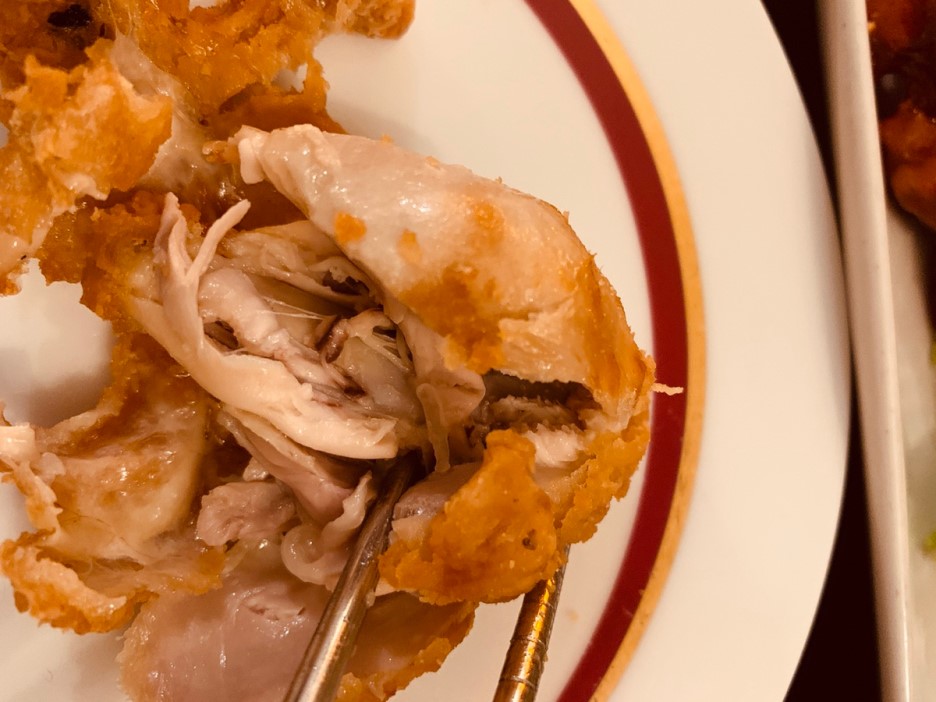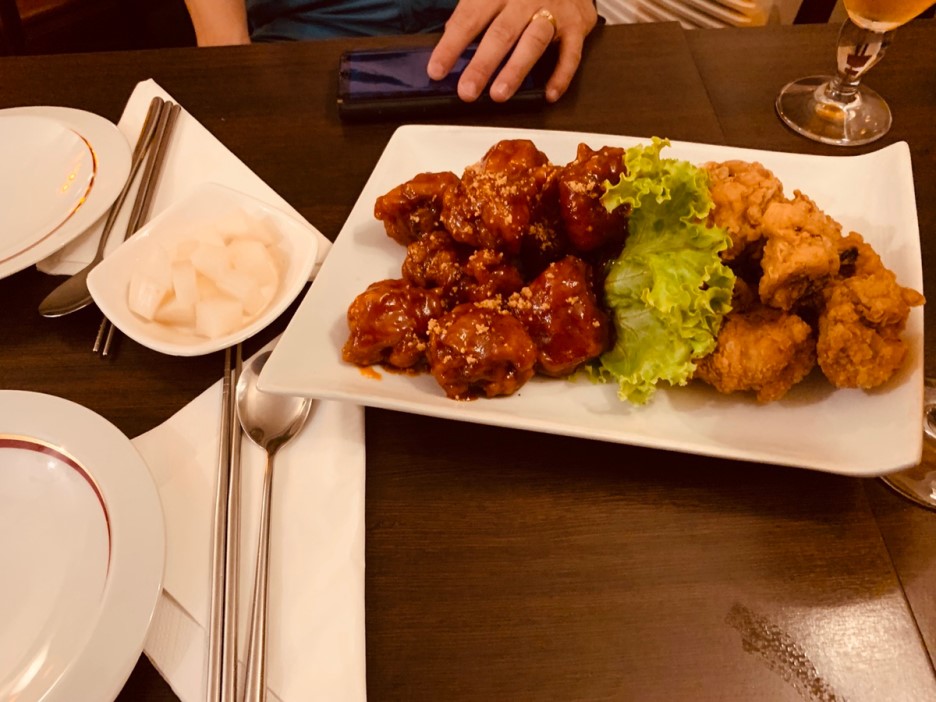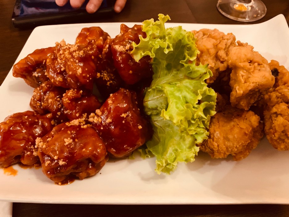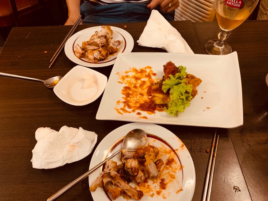 드디어 기다리고 기다리던, 치킨(양념치킨, 프라이드)이 나왔습니다. 맥주 한 잔을 들이켜주고, 프라이드 한 조각을 나이프가 아닌, 숟가락으로 고기 살을 분리해줍니다. 닭고기의 신선도는 일딴 만족!!! 닭 뼈가 검은색으로 변하는 냉동닭이 아닌 생닭으로 조리를 하셨네요. 치킨의 튀김옷은..... 그냥 페스..... 한국에서 먹어보기 힘든 맛이네요. 맛을 표현하자면, 나어렸을 때... 할머니께서 치킨을 튀겨주셨던 맛?(신선한 닭은 밑간하지 않고 그대로...... 닭은 향기를 그대로 느낄 수 있었던 맛..... 닭에서 닭 냄새가 많이 나네요)