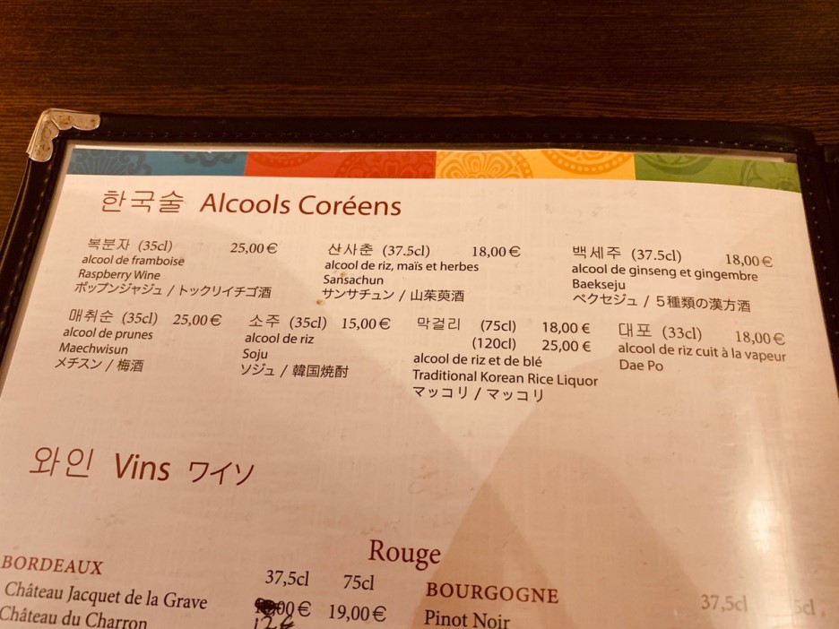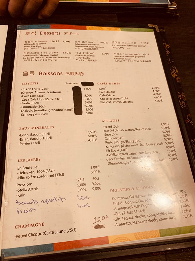 우선 메뉴판을 보고, 깜놀!!! 프랑스 물가가 비싸다고 이야기는 많은 들었지만.... 프랑스 물가를 피부로 느끼는 순간, 치킨이(33,000원), 생맥주 한 잔에 12,000원, 어묵탕이 51,000원..... 음식 주문하기 겁이 날 정도로 비싸네요. 프랑스에 도착한 당일이라 그런지 몰라도^^ 조금씩 적응이 돼가겠죠? ᄒᄒ 한국에서 유명한 치맥!!! 프랑스에 첫날 먹고 싶었습니다. 그래서 생맥주 2잔에 치킨 한 마리를 주문했습니다. 이렇게 간단히 주문했는데 43유로(58,000원)이네요. 한식당이다 보니 치킨 외 다양한 한국 음식이 있더군요. 오늘은 먼저 치킨부터~~