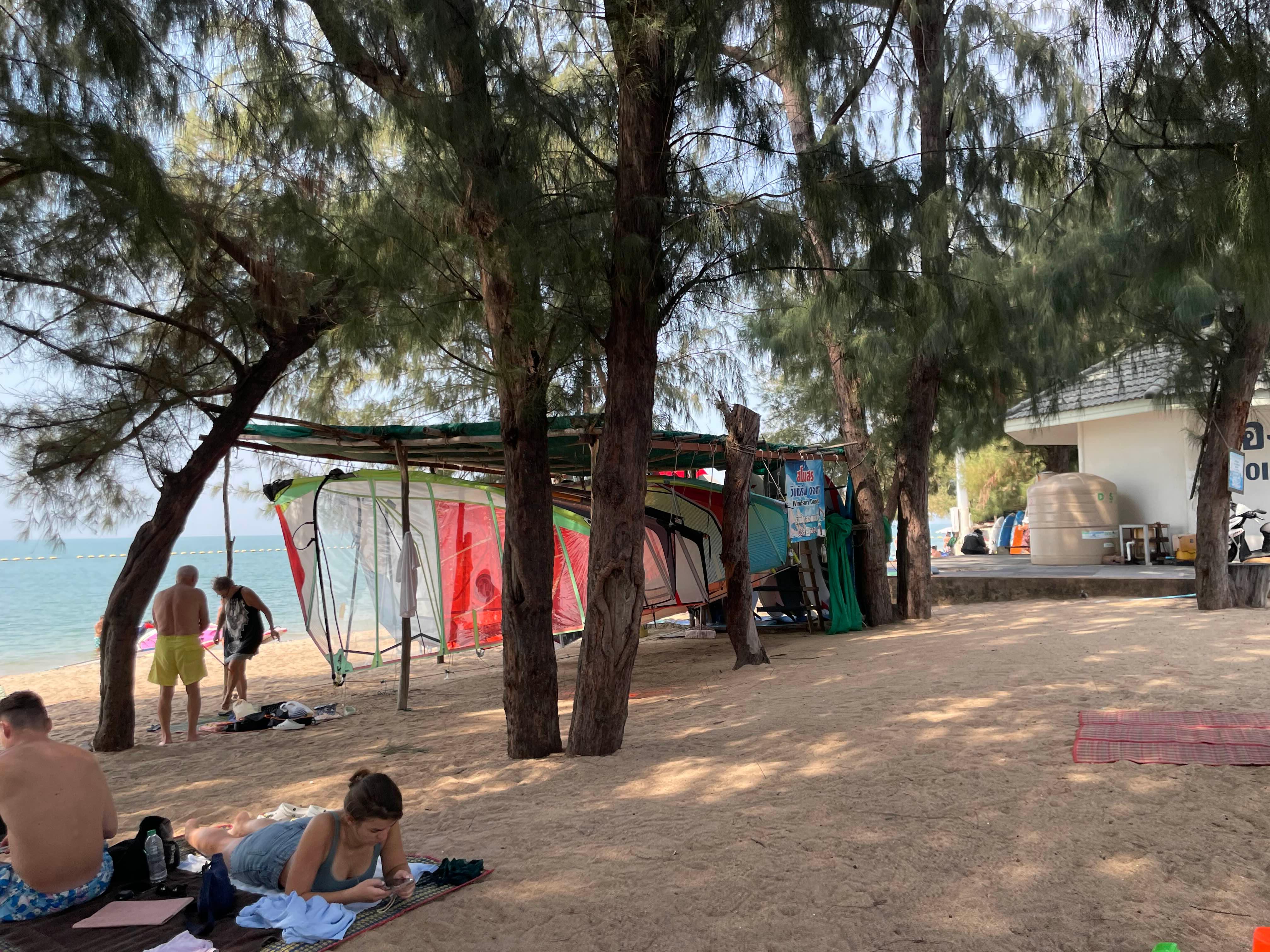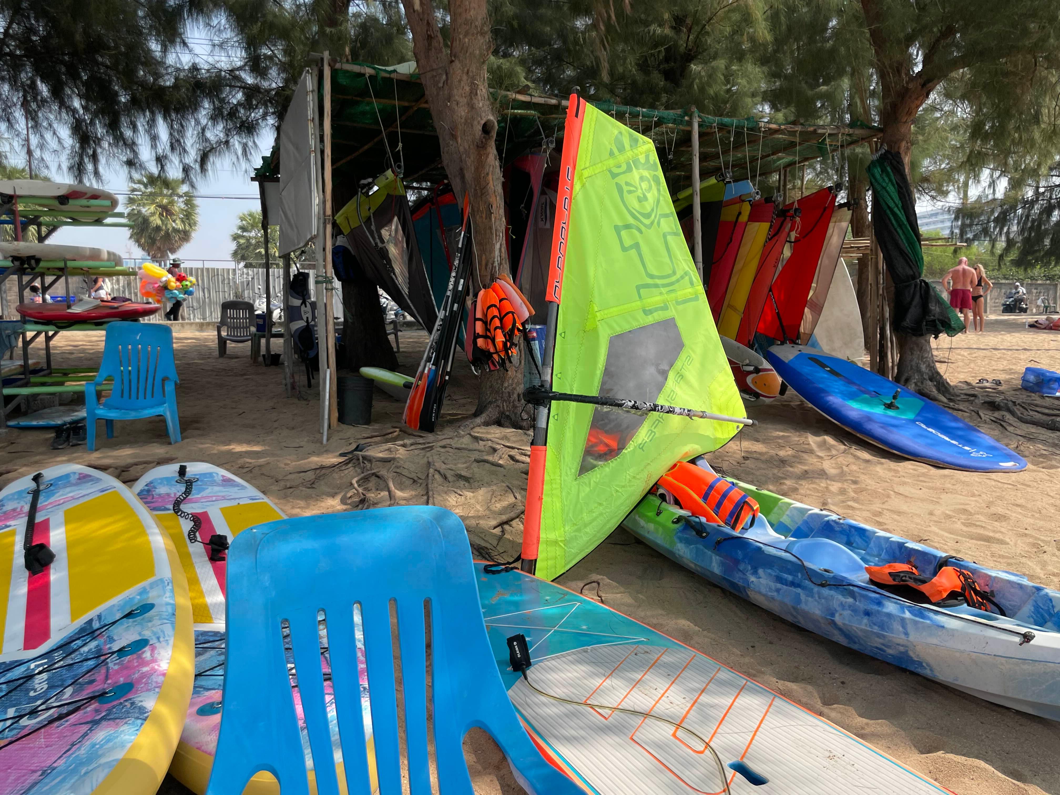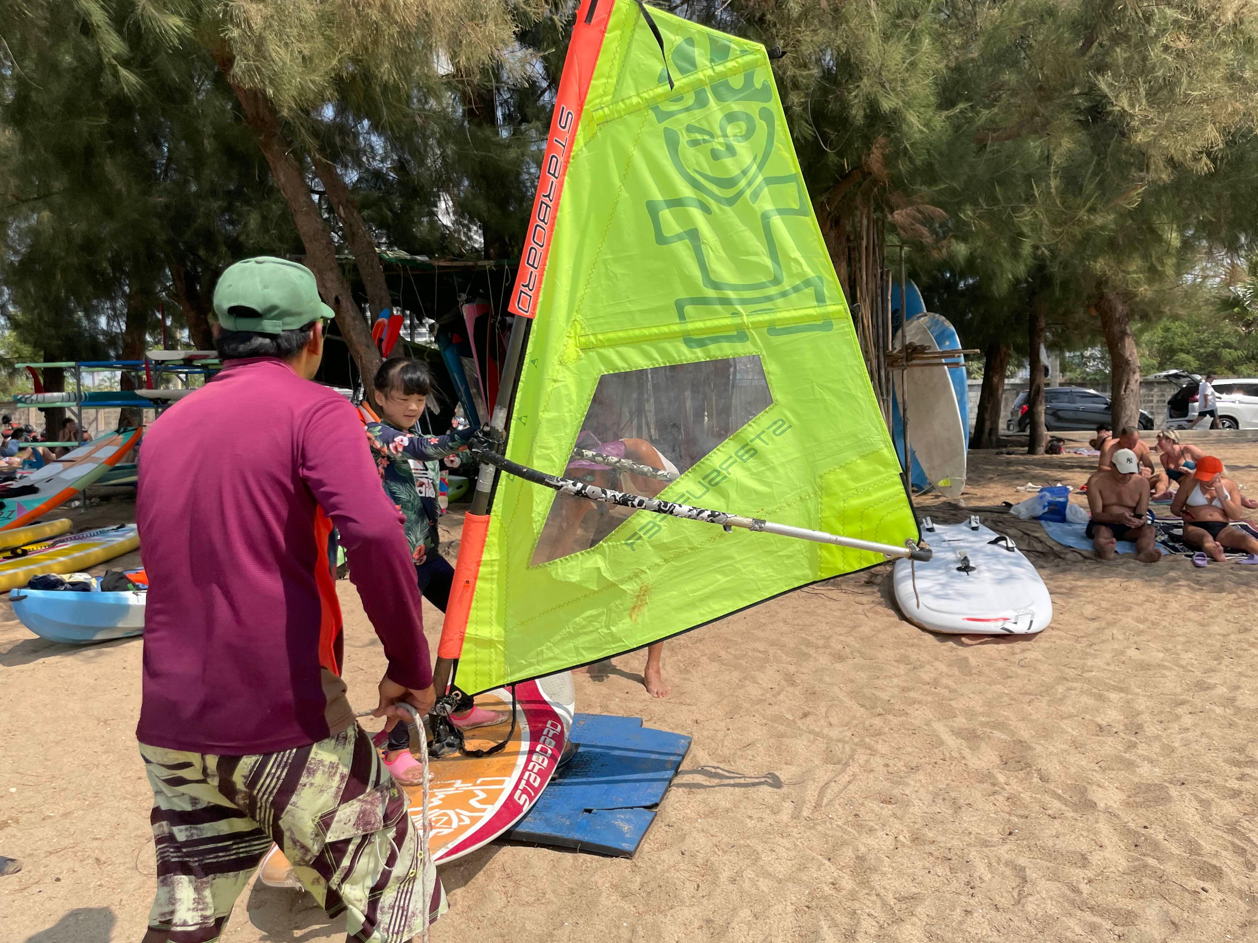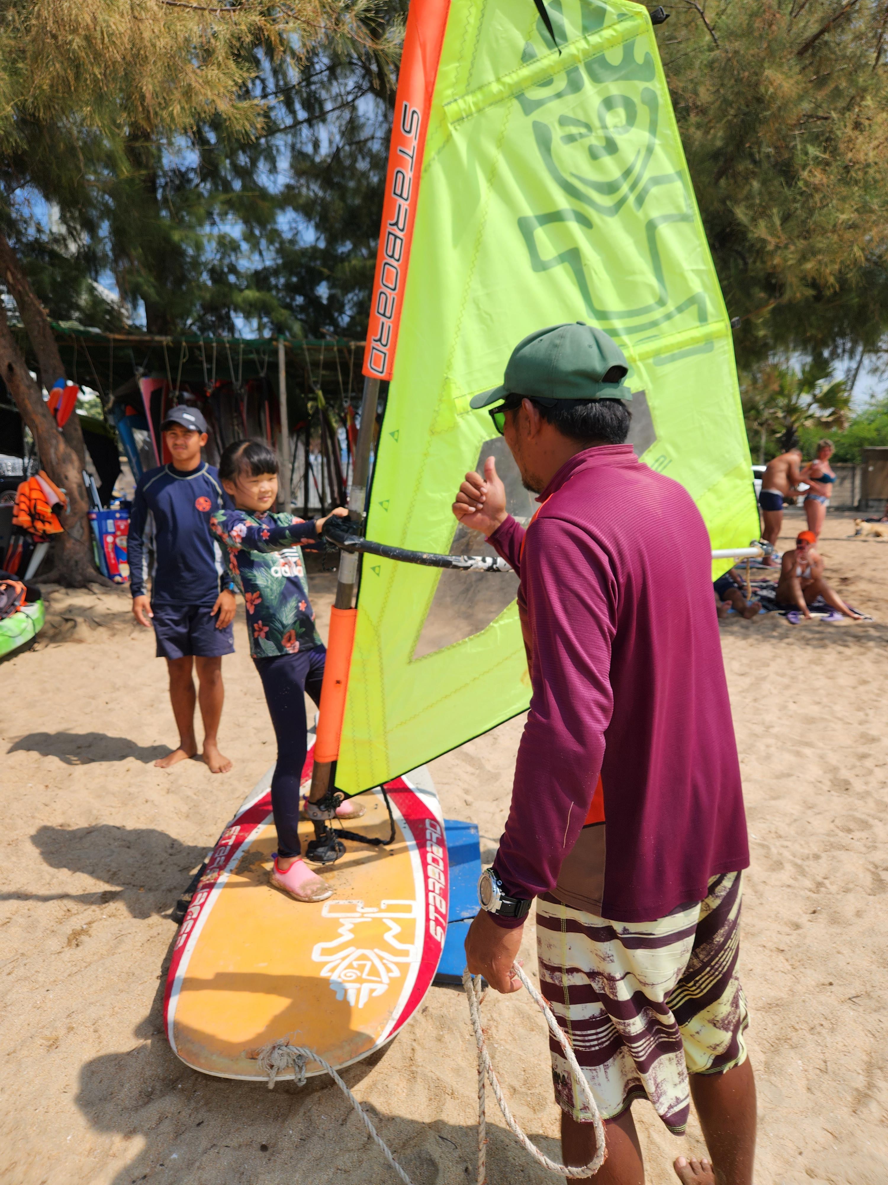 윈드서핑 강습요금은 1시간에 1000밧, 3시간에 2,500밧입니다. 임대는 500밧!