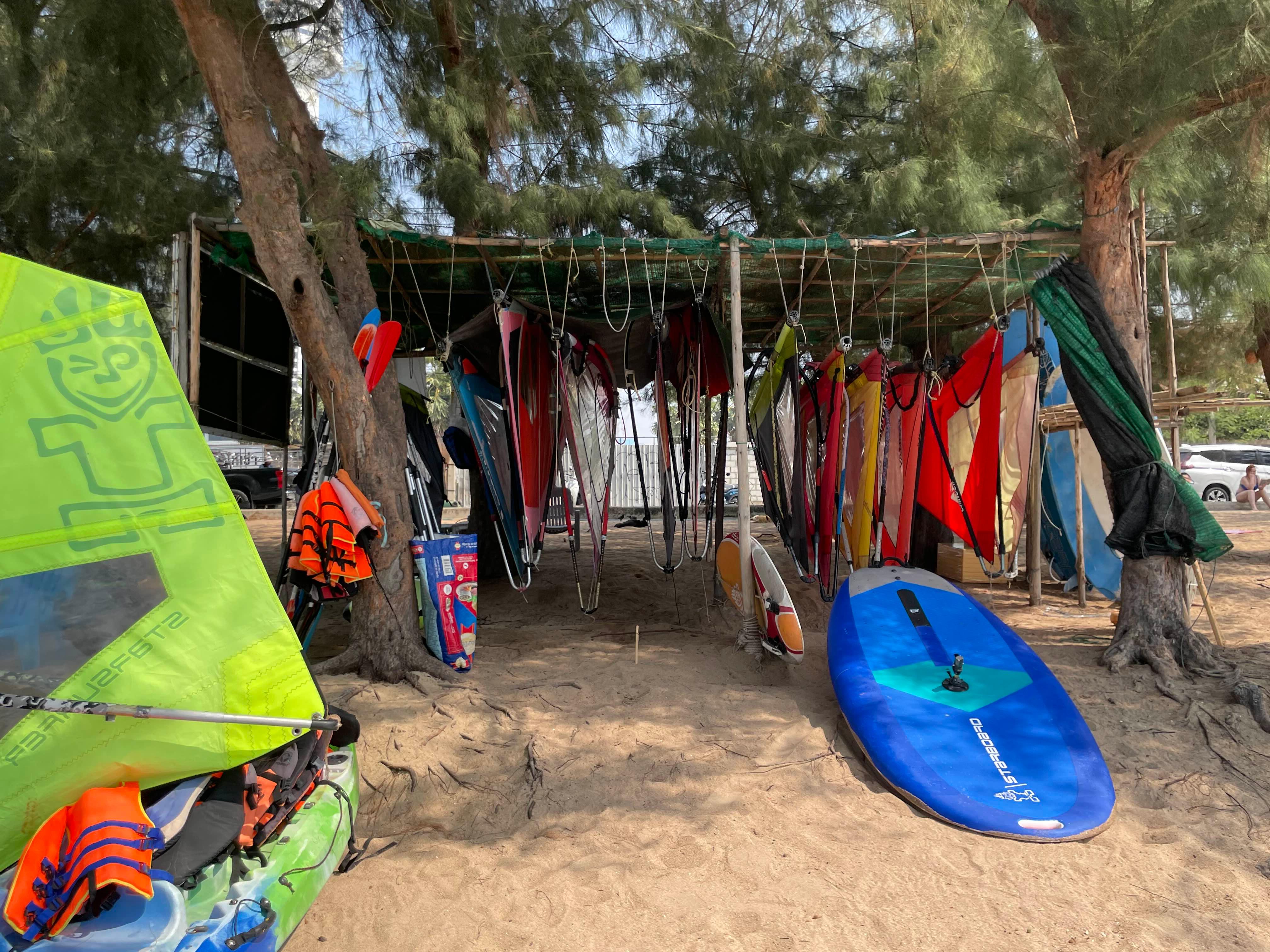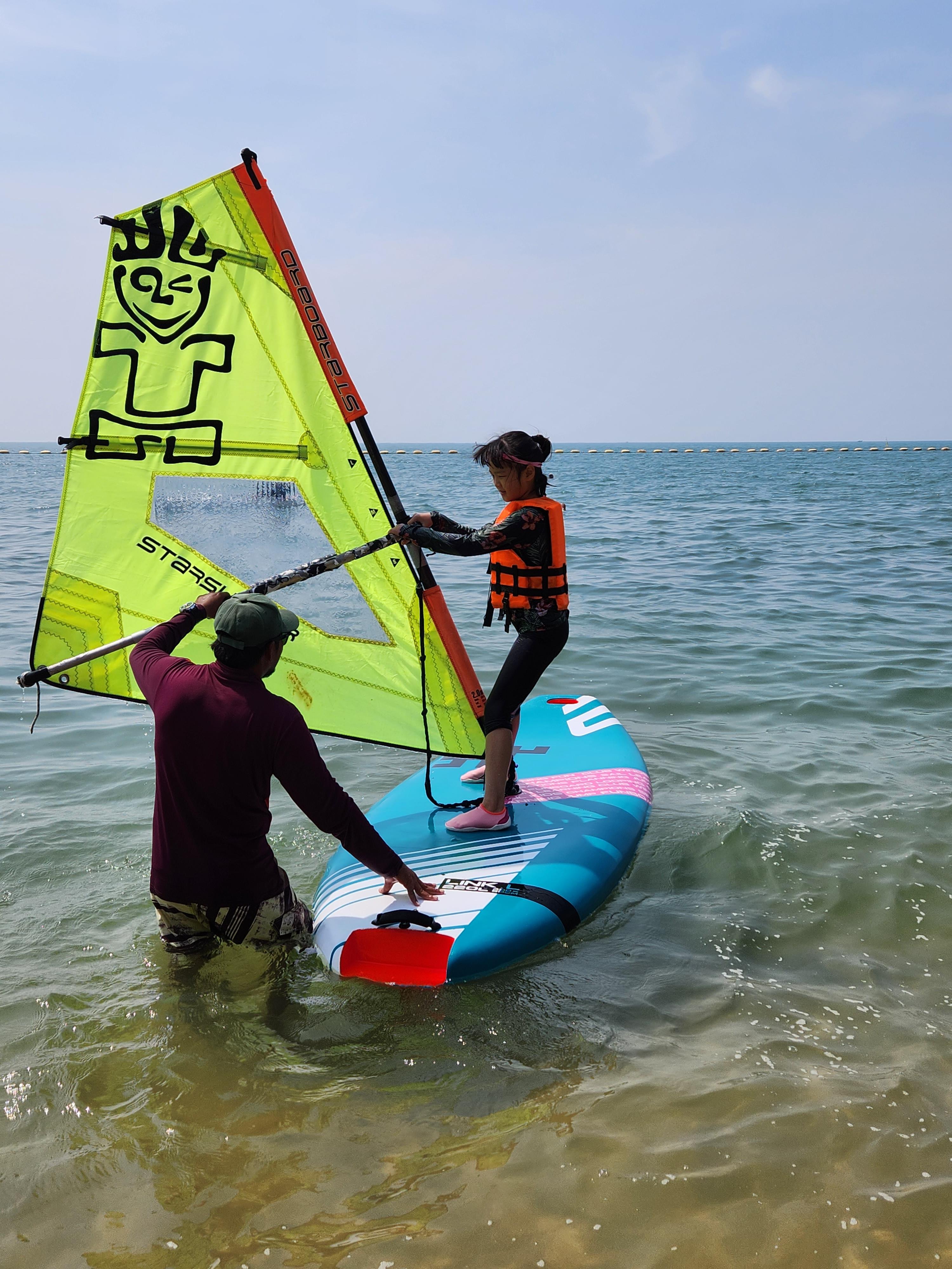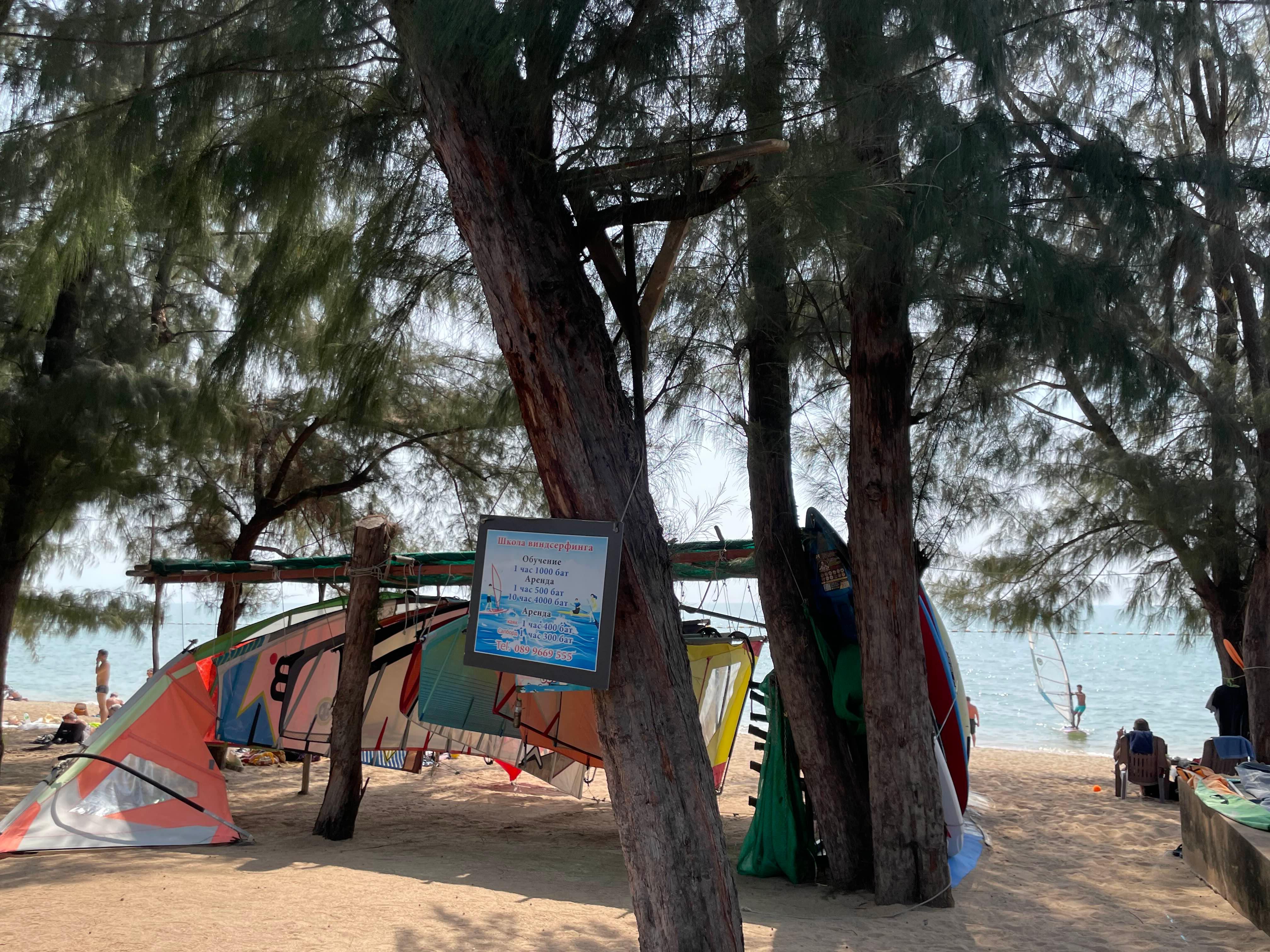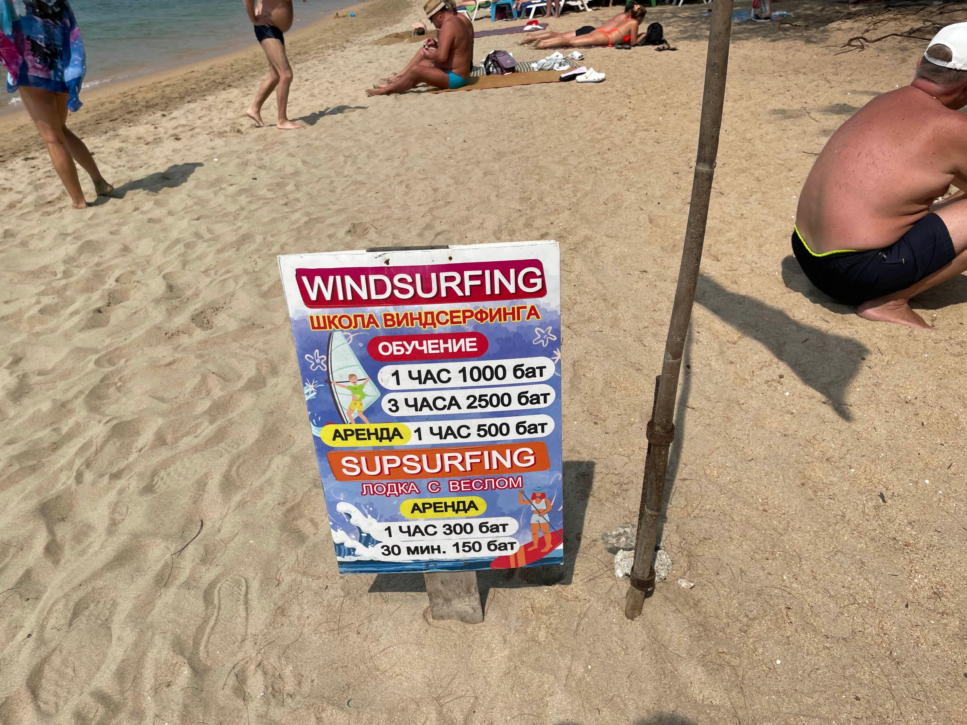 윈드서핑 강습요금은 1시간에 1000밧, 3시간에 2,500밧입니다. 임대는 500밧!