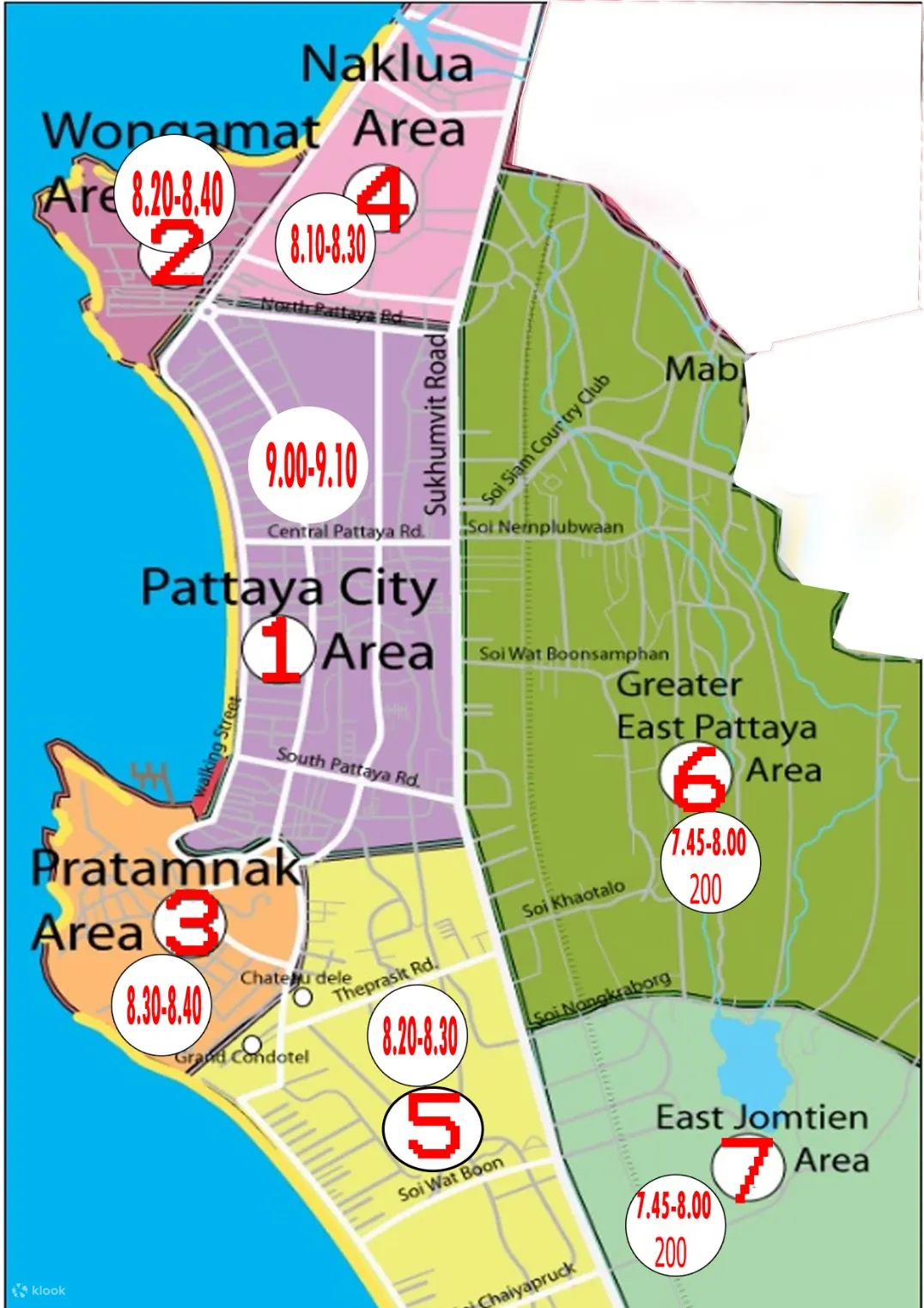 클록을 다시 찾아보니... 파타야 지역에 따라 숙소 픽업시간이 있다. 그 시간에 숙소 앞에 대기하면, 픽업차량(톡톡)이 도착해 있다. 우리는 숙소 안에서 연락이 오기를 계속 기다렸는데, 안 와서... 숙소 밖에 나가보니.. 차량이 기다리고 있다.;;