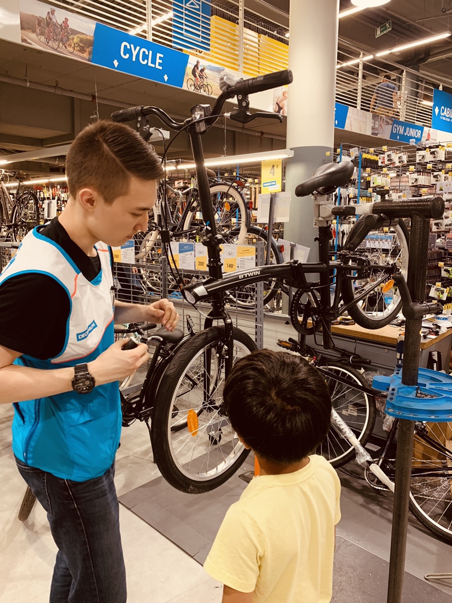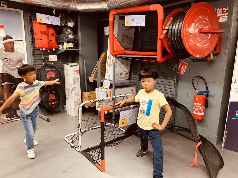자전거 선정 후 계산대하고 영수증을 보여주면 매장 직원이 자전거를 세팅(핸들, 브레이트, 안장 등) 해줍니다. 이런 세팅은 나도 하는데... 왠지 잘 생긴 외국인이 자전거 세팅하는 모습을 지켜보는데.... 왠지 전문적인 거 같네요.ㅋㅋㅋ이 매장 직원은 부모님 중 한 분이 한국인이라 하시네요. 동양 스타일이 났다 했더니... 자전거 세팅은 특히 브레이트 세팅이 가장 중요한데?(브레이크가 모두 잘 잡히도록 세팅은 허접한 세팅이고.... 앞바퀴 브레이크는 약하게, 뒷바퀴 브레이크는 강하게 세팅하여 브레이크를 동시에 잡았을 때 안정적으로 멈추게 세팅이 중요하죠. 그 세팅을 잘 맞추더군요.ㅎㅎ 자전거 세팅하는 동안 아이들은 축구용품에서 한 장!!