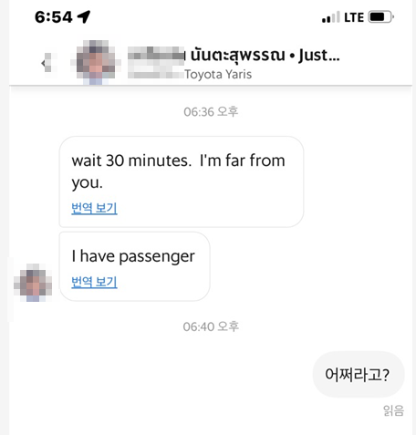 가끔 아래 같은 애들도... 승객을 태우고 있으니, 30분 기다리라는... 암튼 취소하면 되겠지만.. 취소하면, 취소수수료를 취소한 사람이 지불해야 한다.ㅋㅋㅋ