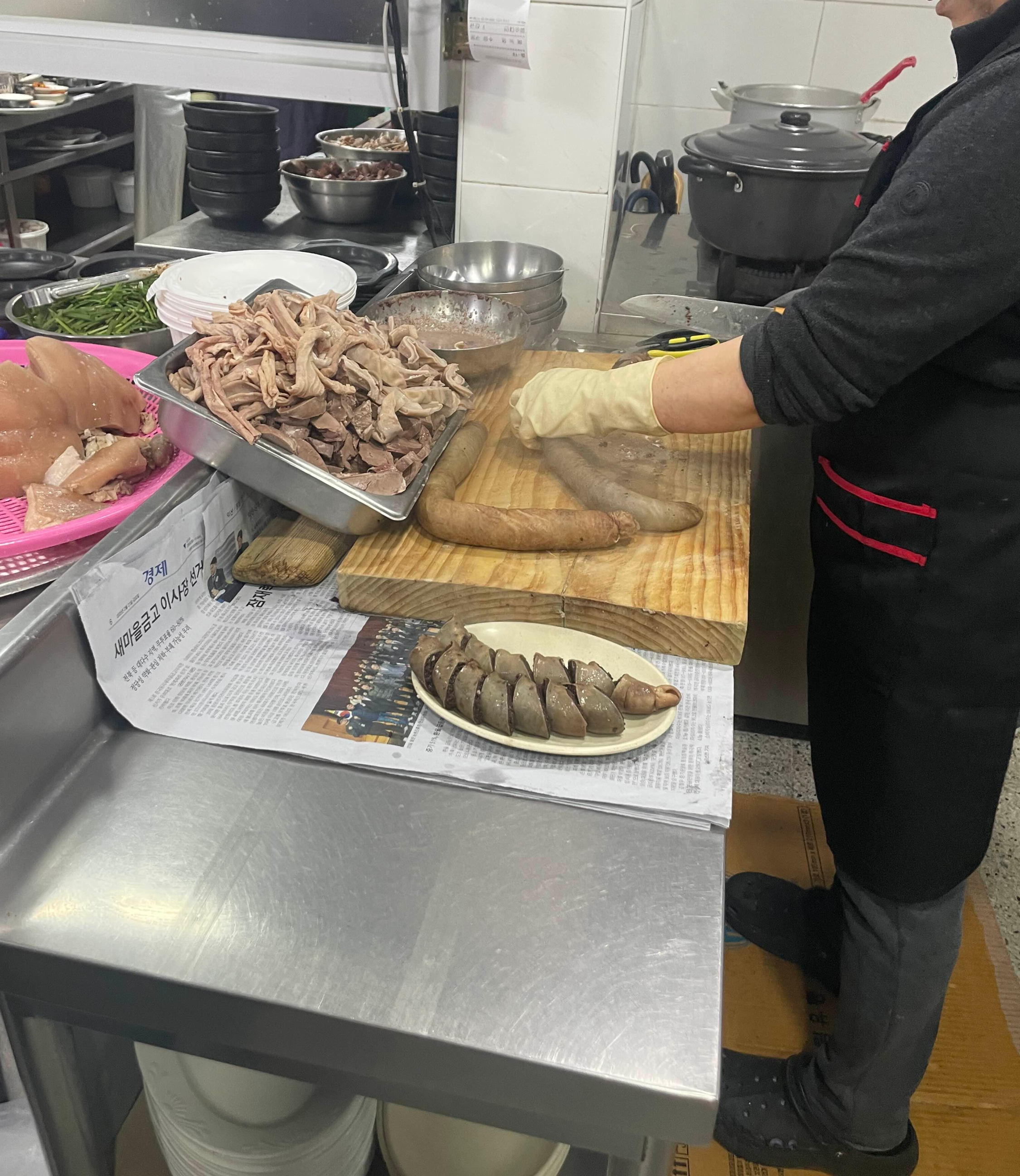 식당에 들어서면... 주방 바로 앞에서 순대와 내장을 썰고 계시더군요.