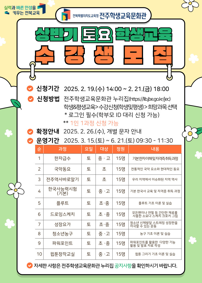 전주학생교육문화관 홈페이지에 들어가면, 다양한 프로그램을 운영한다. 교육비는 무료!!