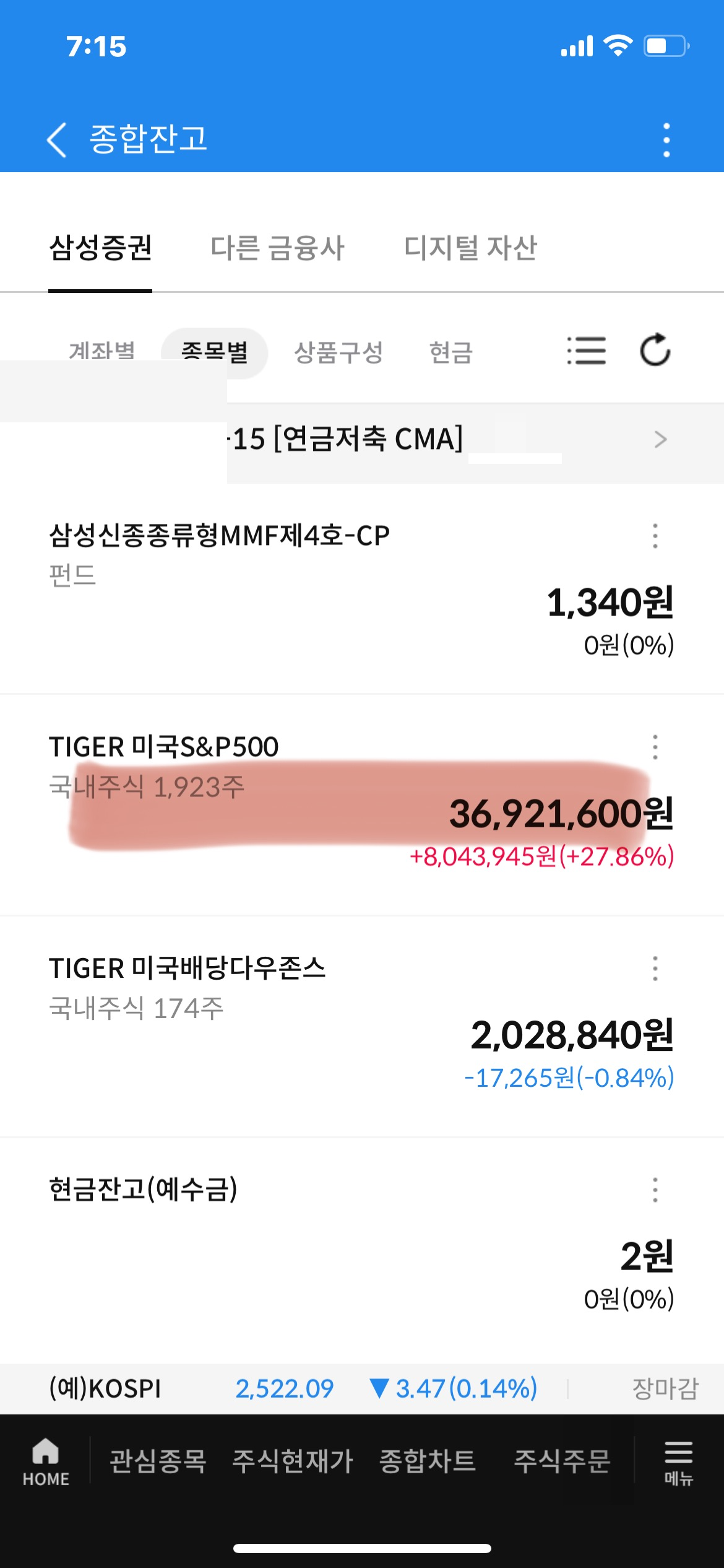 - 4,712주, 대략 7천만 원 정도 매수했는데, 현재 9천만 원 정도로 수익률이 무난한 편이다.