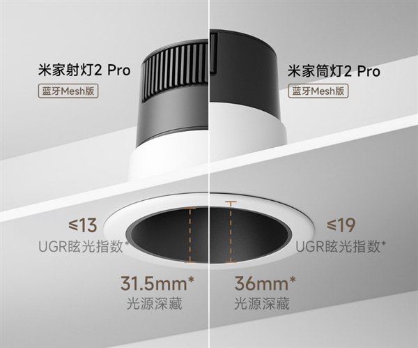 눈부심 방지 디자인을 갖춘 Mijia Downlight 2 Pro의 광원은 36mm 깊이에 숨겨져 있으며 UGR 눈부심 지수는 ≤19입니다. Mijia Spotlight 2 Pro는 31.5mm의 검은색 깊은 컵 디자인을 적용했으며, UGR 눈부심 지수 ≤13으로 직사광선으로 인한 불편함을 줄여줍니다.