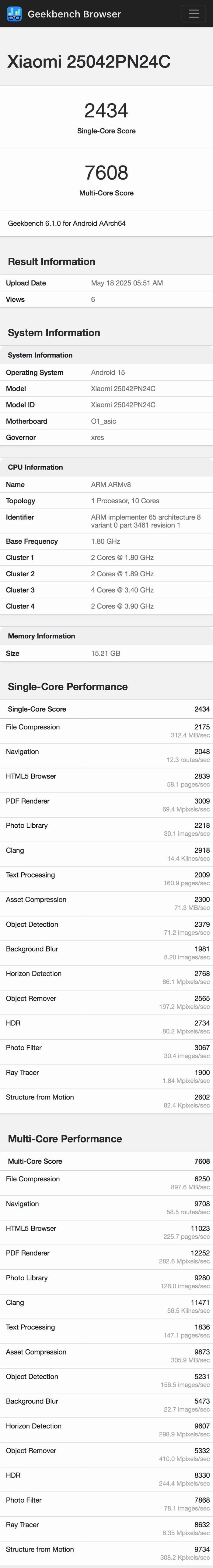 IT之家 5 月 18 日消息,Geekbench 6.1.0 跑分平台今日出现了一款“Xiaomi 25042PN24C”新机的成绩,也就...
