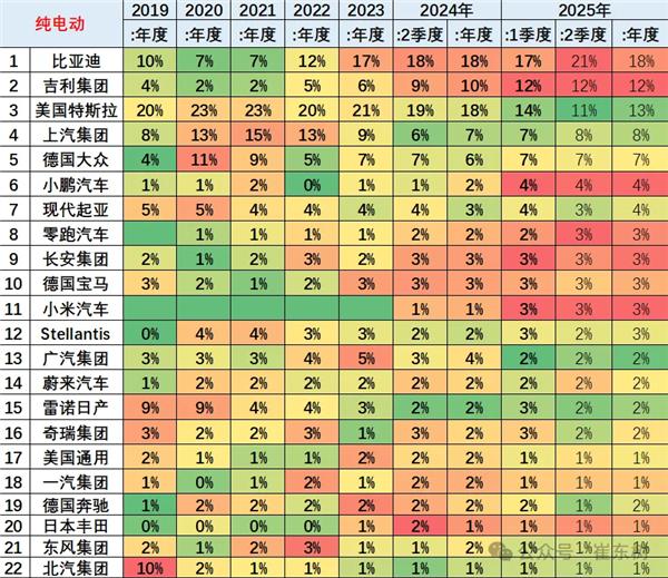 중국승용차협회 사무총장 최동수가 발표한 자료에 따르면, 2025년 2분기 글로벌 순수 전기자동차 시장 점유율 3대 기업은 BYD, 지리, 테슬라로 각각 21%, 12%, 11%를 차지했다. 그중 2024년에야 배송을 시작할 예정인 샤오미 오토는 현재 점유율 3%로 11위를 차지했습니다. 시장점유율은 리프모터, 창안, 독일의 BMW 등과 비슷하며, GAC, NIO보다는 높습니다.