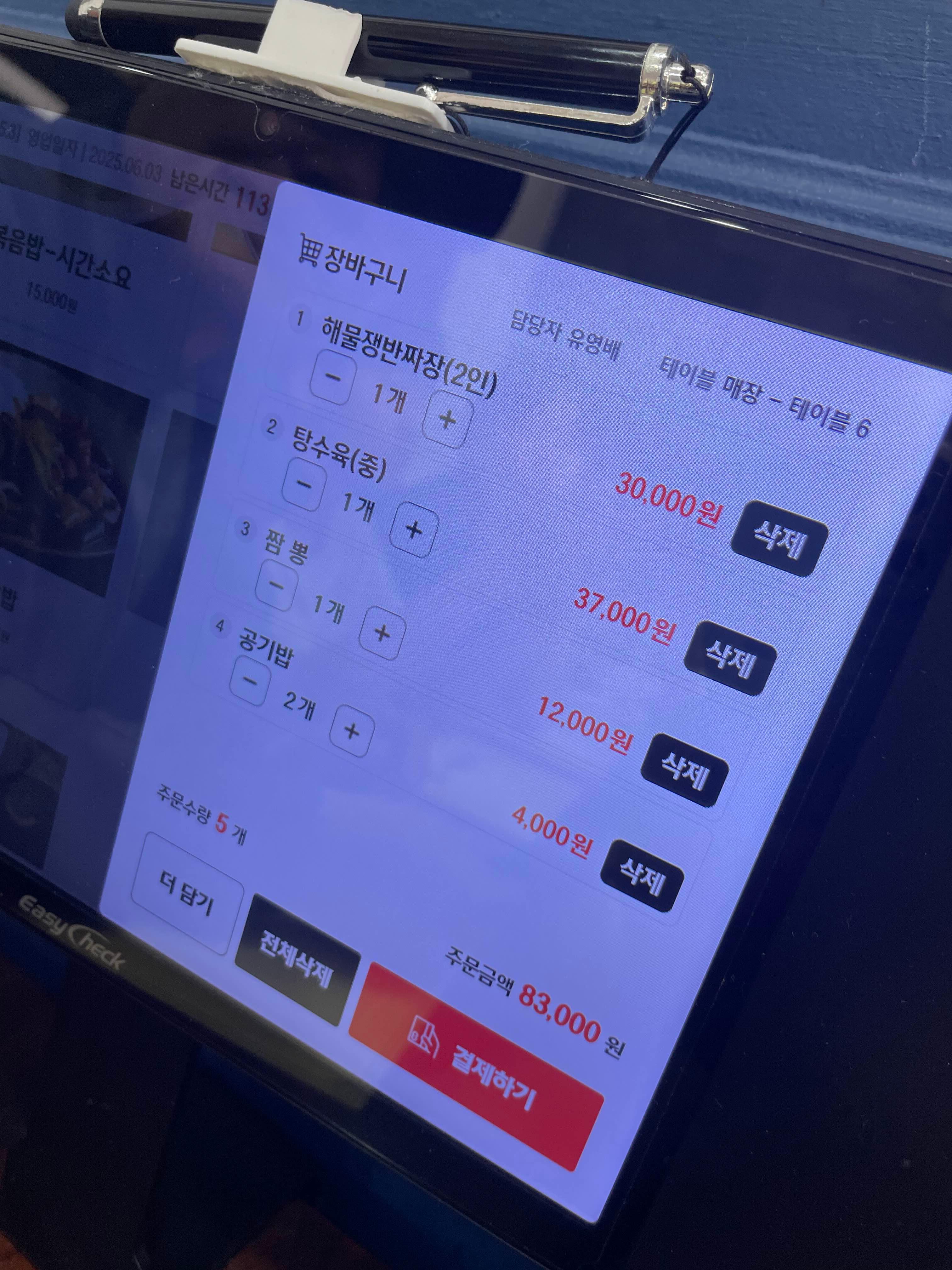 쟁반짜장 2인 3만 원, 탕수육 중 3.7만 원.... 짬뽕 1.2만 원으로.... 가격이 좀 나가는 중식당이다.