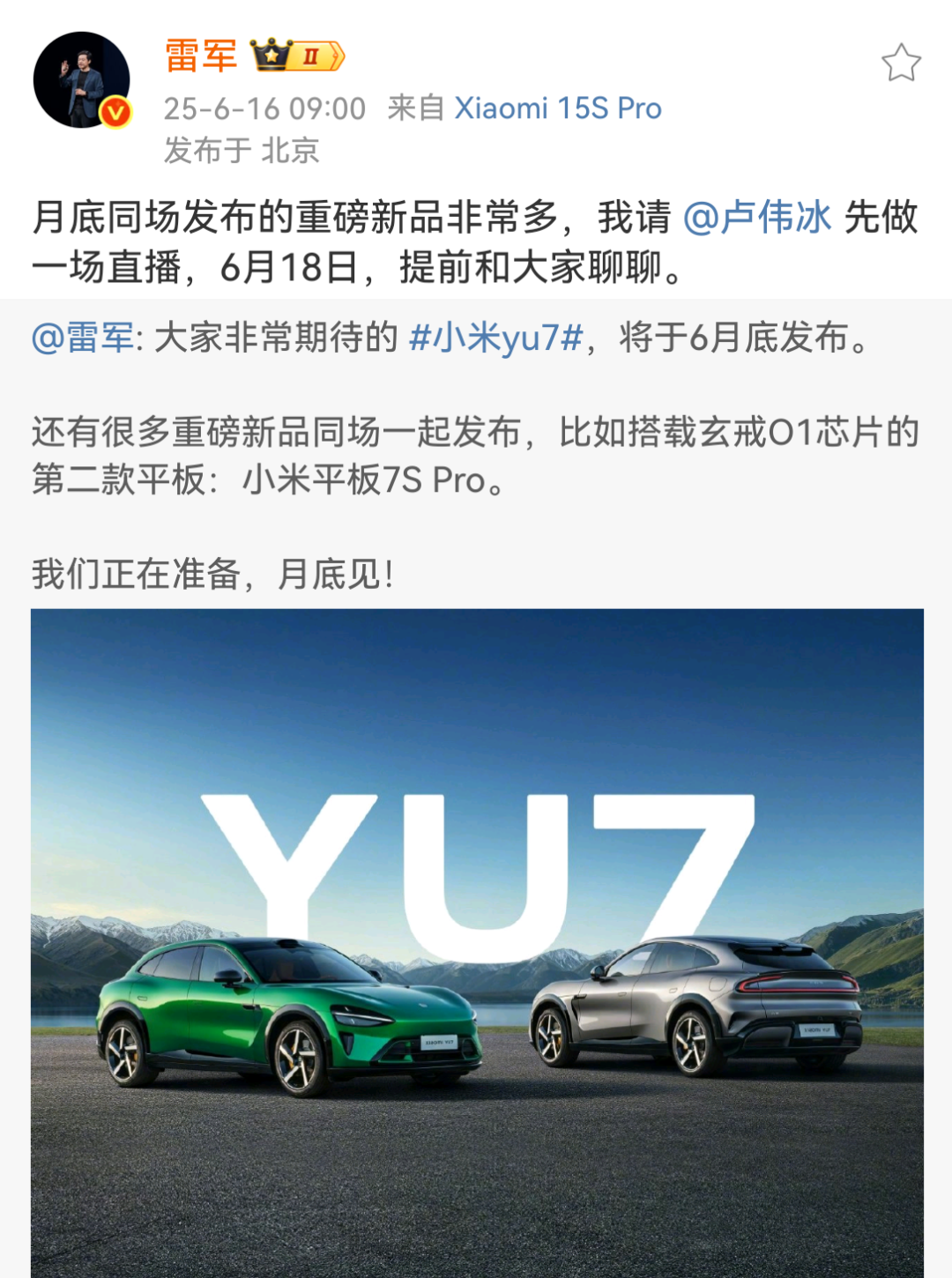 또한, 레이쥔은 웨이보에 6월 에 열리는 샤오미 YU7 출시 컨퍼런스에서 많은 신제품이 함께 출시될 예정이며, 여기에는 쉬안지에 O1 칩을 탑재한 두 번째 태블릿인 샤오미 태블릿 7S Pro 도 포함된다고 게시했습니다 .