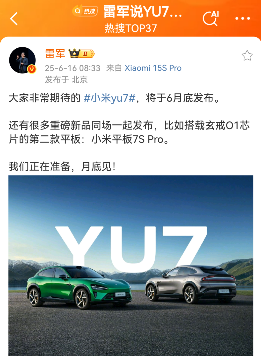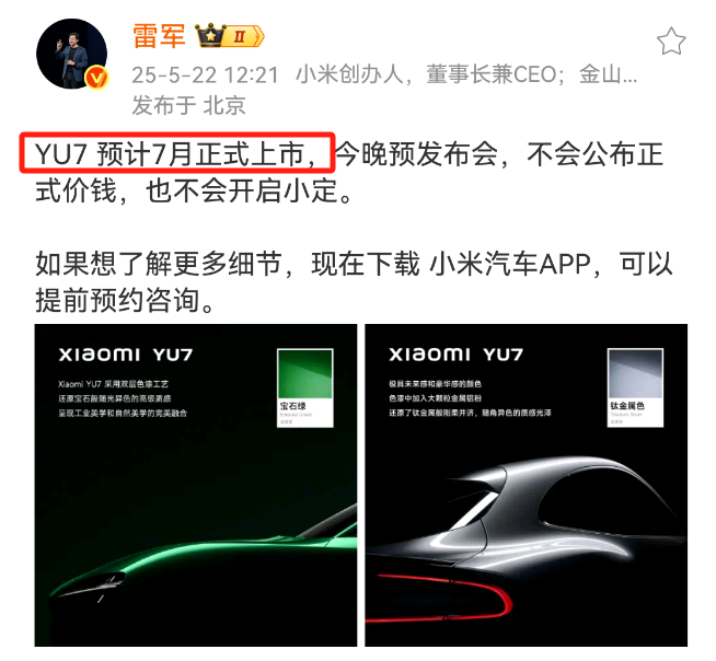 비교해 보면 , 샤오미 YU7 의 출시 시기가 예상보다 앞당겨졌음을 알 수 있습니다. 5월 22 일 , 레이쥔은 웨이보에 샤오미 YU7이 7월 에 공식 출시될 예정 이라고 게시했습니다 .