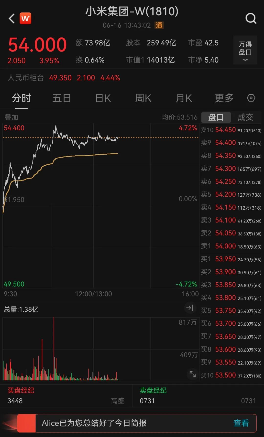 6월 16일 오전 , 홍콩 증시가 개장한 후 샤오미 그룹의 주가는 2% 이상 상승했습니다 . 본 기사 작성 시점 기준, 샤오미 그룹의 주가는 주당 54.00 홍콩달러 로 3.95% 상승했으며 , 총 시가총액은 1조 4,000 억 홍콩달러에 달했습니다.